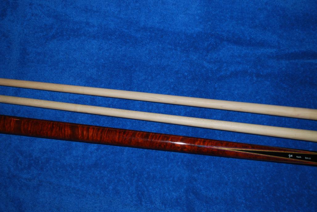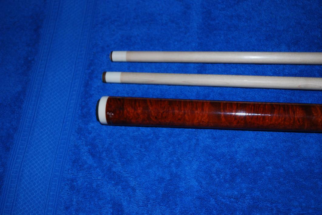 I spoke with Joel Davidas on this cue and he let me know this is 1 of 5 Full Splices he has made over the last 7 years. It has an Ebony nose and the rest is Ambonya Burl. This cue is a real find and would be a great buy for someone. I am wanting SOLD SOLD SOLDShipped in the CONUS. Don't miss out on this cue. It is used with slight wear but still looks good. 1 shaft has a wobble when together with cue. The other rolls good. Wood is amazing on this cue.