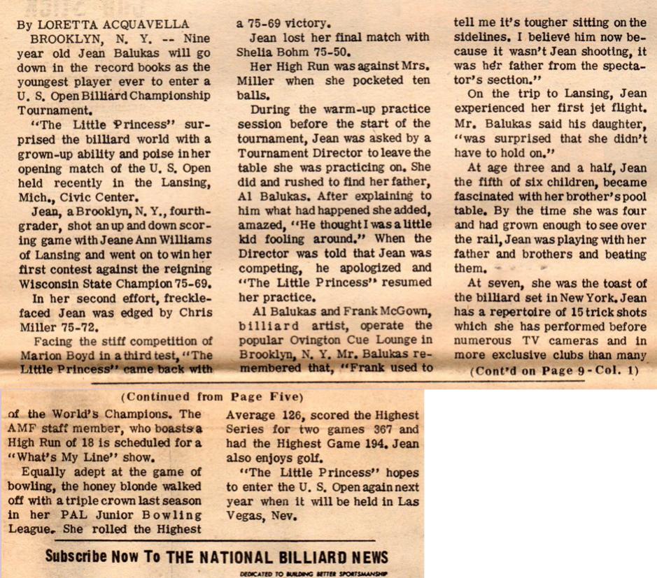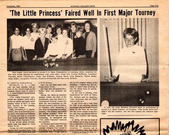 Jean and Allison had a lot in common , both were the youngest to ever be champions at their games , Allison was 15 I believe when she won her first national snooker title and then 17 for the world title, Jean was 9 when she came in 5th at the world straight pool championships for women and 3 years later won it . I believe she was the youngest world champion at anything .