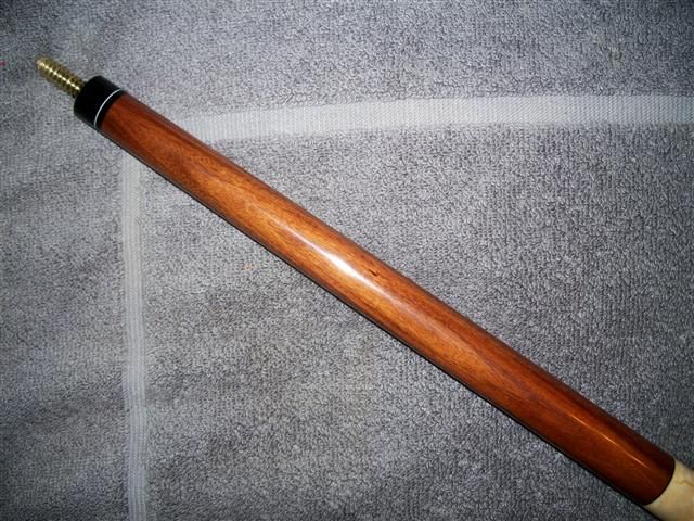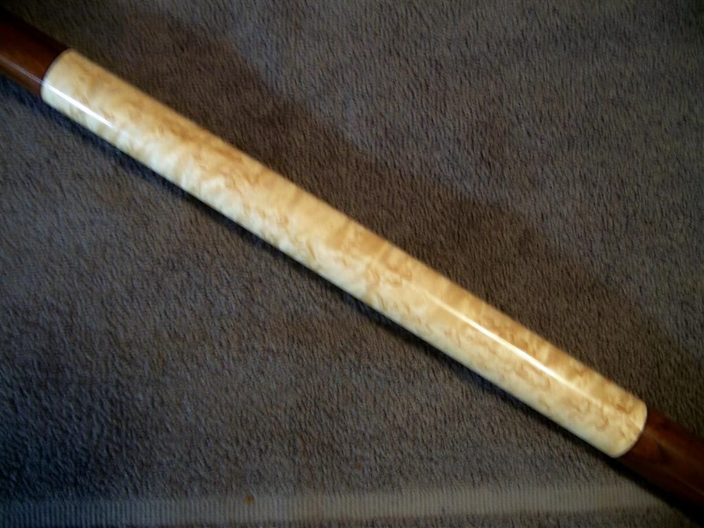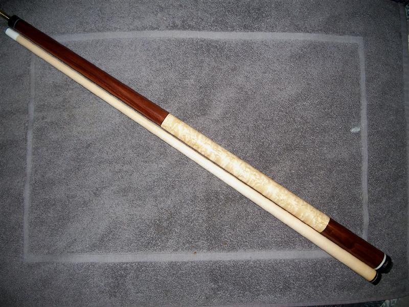 New cue with a beautiful wood combo. Super piece of birdseye. specs: 19.4 0z 13mm w/elforyn ferrule & milkdud tip. flat top 3/8 10 pin SOLD. Tim 919 247 3391 B]