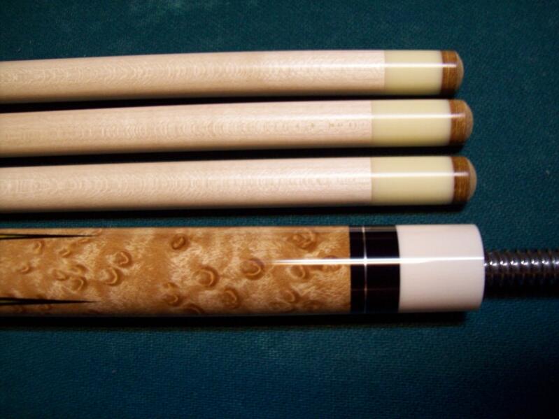 This ebony and birdseye Hoppe cue arrived last Saturday from Jeff's shop. Once again start to finish with this project was great, as Jeff was easy to communicate with and was always concerned about customer satisfaction. The two 13mm shafts weigh in at 4.3 oz each, the low deflection shaft (top) weighs in at 4.2 oz. It is fitted with an Ivory flat face 3/8-10 (a workout to tighten) and a wizard medium layered tip.