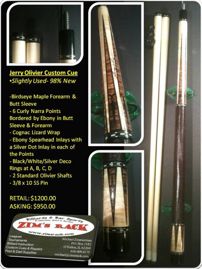 Zims Rack Promoting the Cueing Arts Silver Member Nov 2, 2012 #1 This is a slightly used (98%) Jerry Olivier cue I received in trade a couple weeks ago. I got confirmation from Jerry that this cue value is $1200.00. Any reasonable offers considered! Thanks, Zim Attachments Olivier 1.jpg 96.6 KB · Views: 831