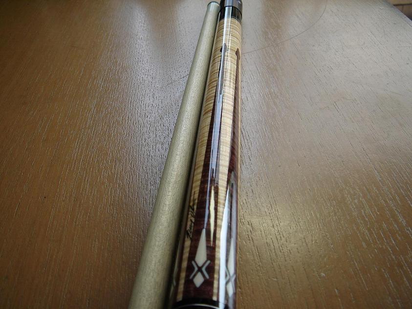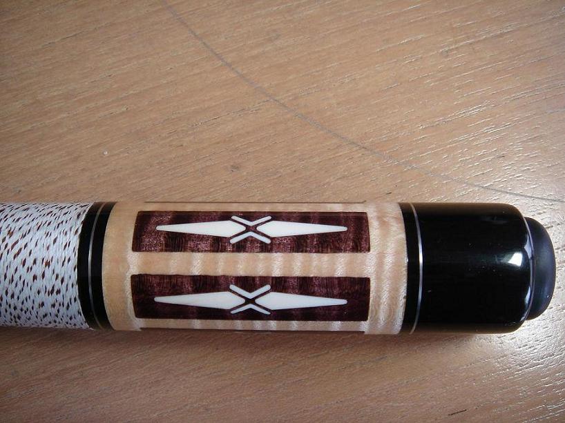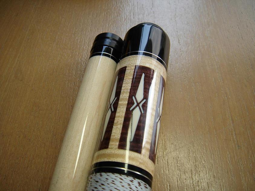 Tiger Stripe Curly Maple forearm with Cinnamon stained Tiger Stripe Curly Maple points & Ivory Inlays. Matching Tiger Stripe Curly Maple buttsleeve with Cinnamon Stained Tiger Maple Windows with Ivory Inlays. Cue has a White/Brown speck Irish Linen wrap & features a 3/8 x 10" flat faces joint.