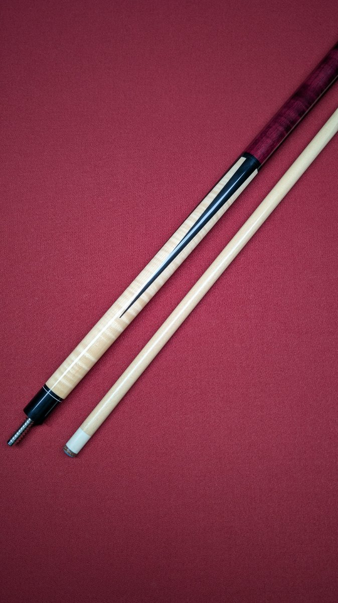 I bought this cue from Jerry O at the 2022 SBE. Very nice purple heart into curly maple. The cue rolls straight together and apart. There are no dings that I can see anywhere, has been very well taken care of. I also bought the extension kit directly from Jerry O so it fits perfectly. Will sell with or without extension.
