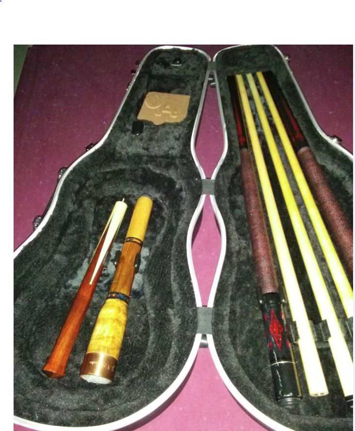 Anyway, converting these viola cases isn't rocket science, but I figured there was a better way to do it than what I have seen on the streets. The cues are very securely mounted in the case and I have a place for a jump butt and a cue extension. I made the cue extension in the picture. You don't see it but I had my brand name for making cues etched into the copper ring at the top, 'JH Exclusive," The copper ring keeps the top wood from splitting if someone tries to shove a butt into that is too big. I had 100 of these things made thinking that whenever I made a cue I would make a matching extension. That didn't work out for long. Most of the time when I make a custom cue I'm so glad to be done with it I don't want to take any extra time making an extension. I know, you guys are realizing that I write way too much. Sorry.
