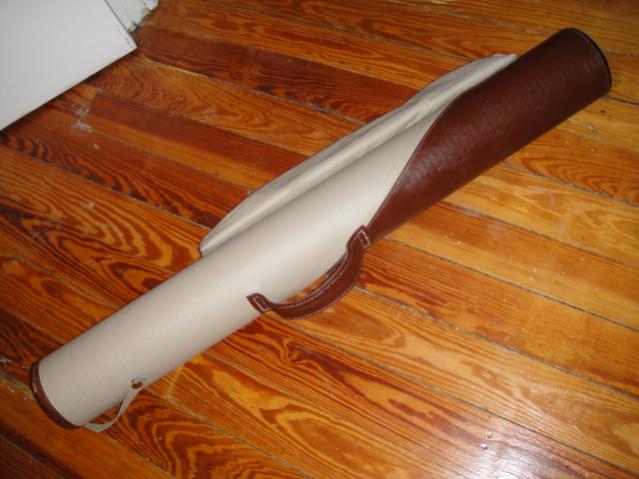This is a very unusual JH CUSTOMS 2 X 4 Leather two-tone case. It's very sturdy and looks to be all handcrafted. Exterior is definately leather over a very hard tube like case. Interior is black the area where the cues are inserted is black felt. It's 34" long with a 20" zippered case. BE DIFFERENT! A bargain for a leather 2 x 4 @ $old