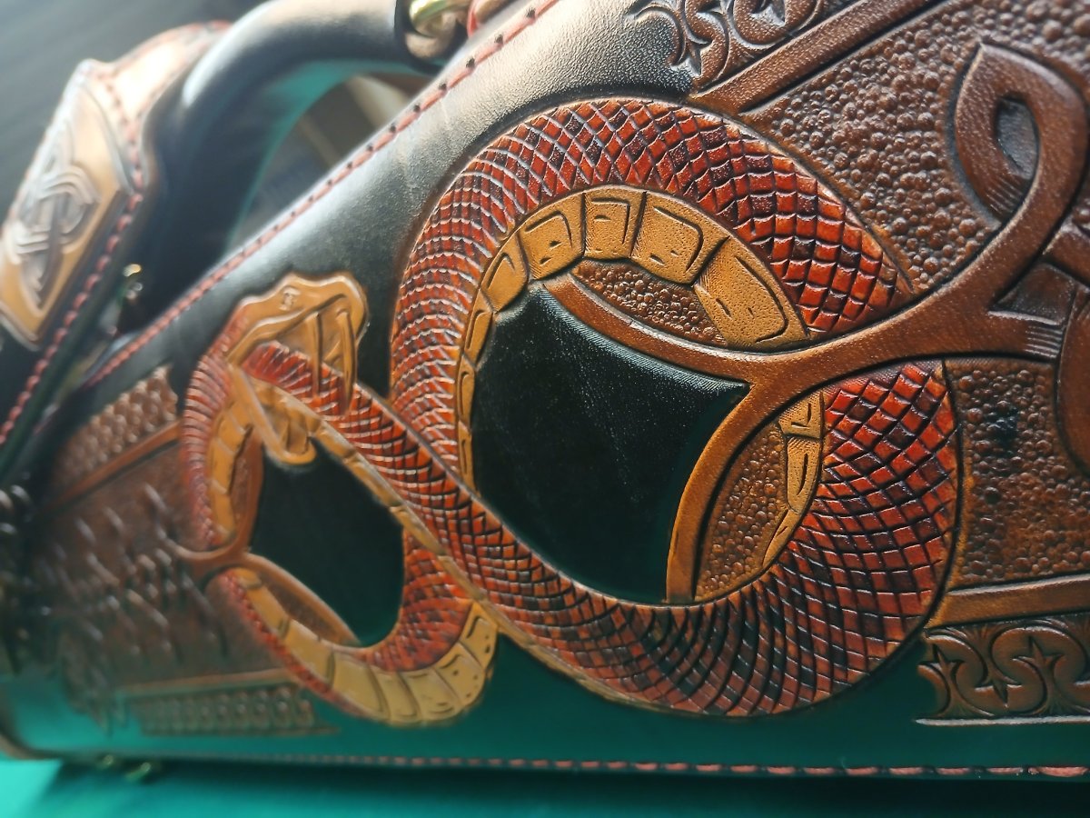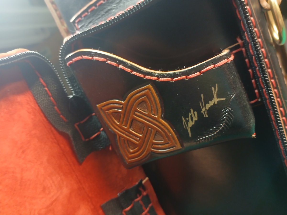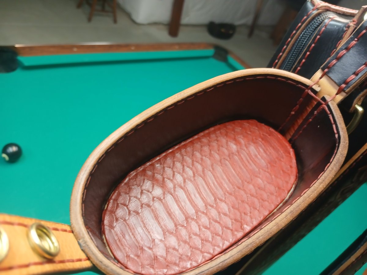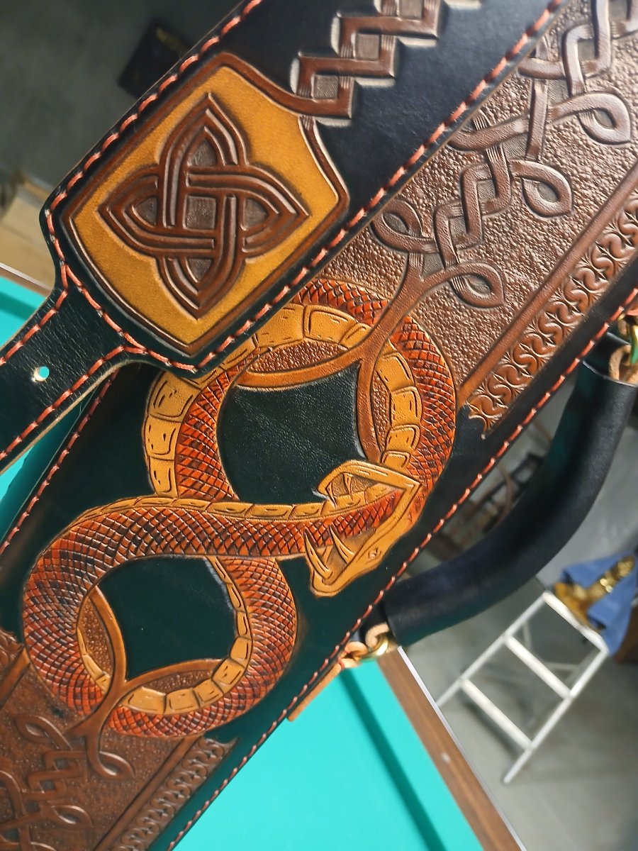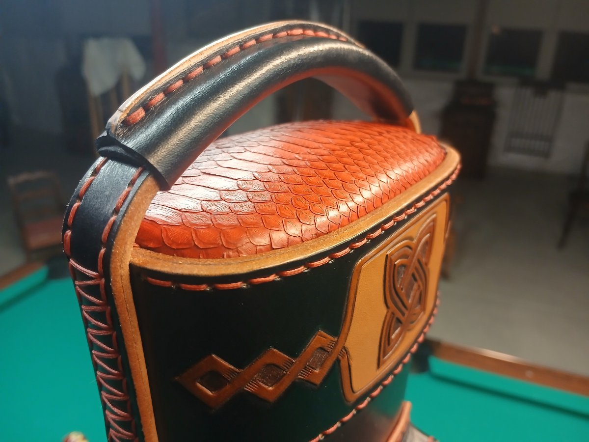 A more traditional Celtic knot is displayed in natural windows at the lid and shoulder pad. The top cap is wrapped in genuine python, which appears inside as well.