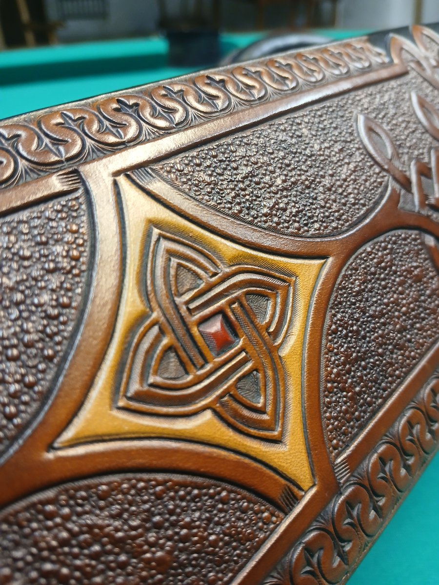 The Celtic tooling is our take on the Tree of Life with its twisting roots intertwined around the Ouroboros, or self-consuming serpent. Custom verbiage is displayed in natural windows on long carved chains that run the length of the body.