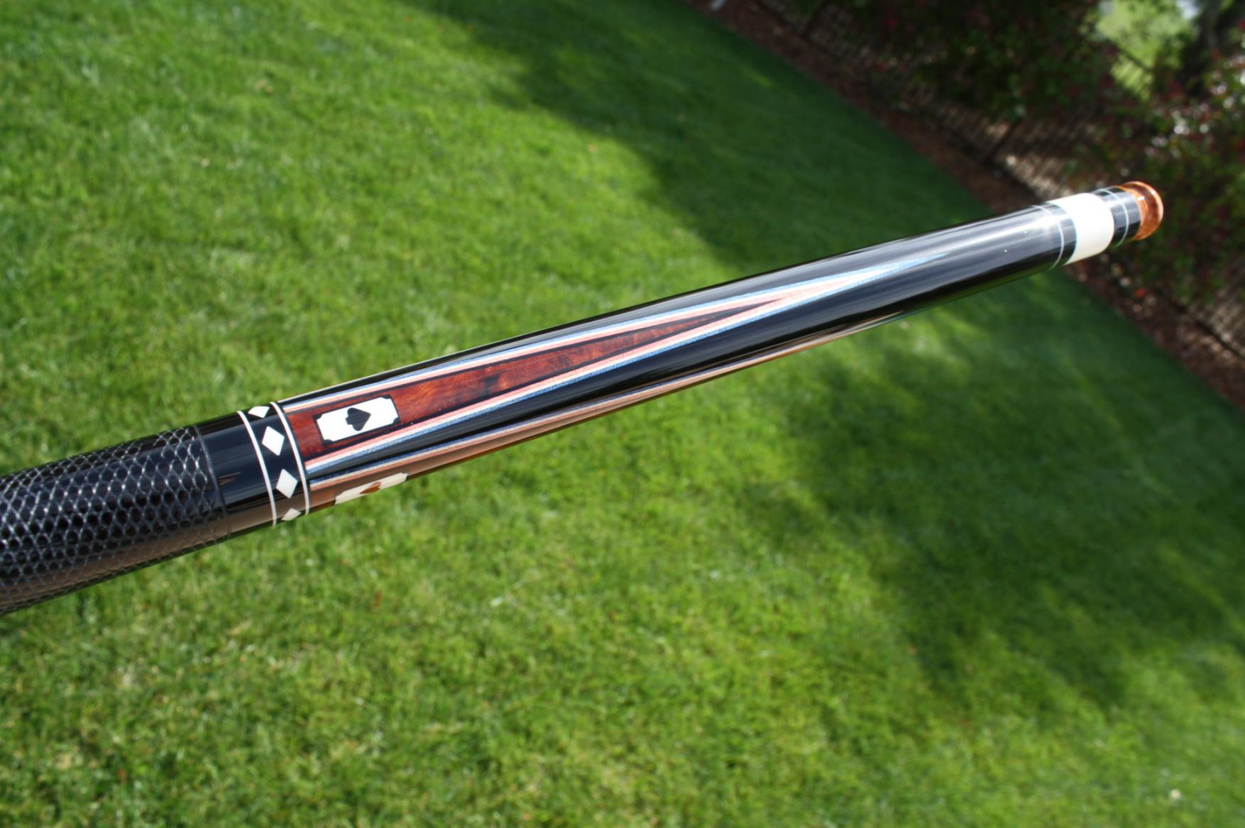 Here is a nice cue with a "Gambler" theme. It is Ebony & Amboyna Burl with all the white being Ivory. The wrap is real Lizard, not embossed leather. It has 4 points of Amboyna Burl & 4 veneers (black, red, white and blue) with inlays in every point. It has very nice rings at all points of Ebony & Ivory. It was constructed by Jim Lee and finished by Jack Madden, including a set of beautiful J/Ps.