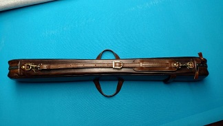 The case is heavy duty with thick leather, strong zippers and carry strap. It does show some slight wear The carry strap was never used. There are two pouches inside for accessory's or a jump handle. Case has signature under the carry strap.