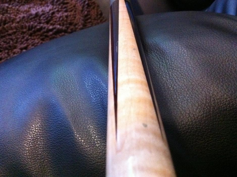 It's a 4 point cue with Cocobola points, and curly(I believe) maple forearm. The cue is in maybe 75-80% condition with quite a number of battle scars on the forearm and buttsleeve. There are not any cracks in the buttcap, however there are a few knicks. You can see in the pictures the blueing in the shafts as well as some of the knicks and whatnot. I tried to document it as best I can.