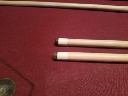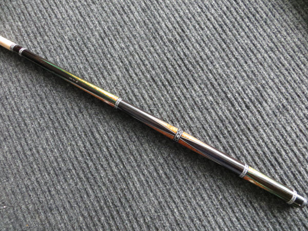 Ebony forearm/handle, with Amboyna points.Green/Black veneers. Excellent playing cue. Comes with 2 shafts, with Triangle tips.I believe Ivorine ferrules. One shaft slightly used, one unused. Nice Crisp hit.
