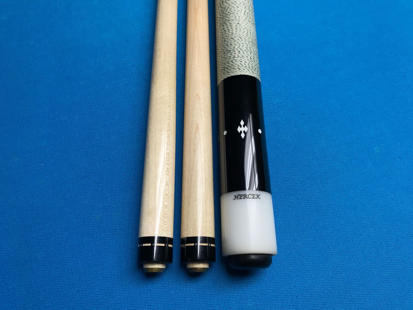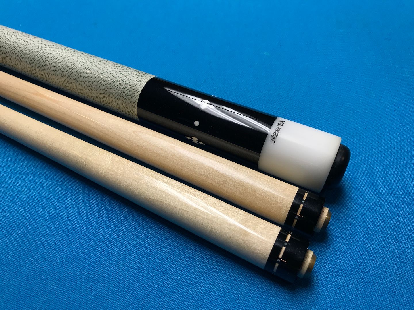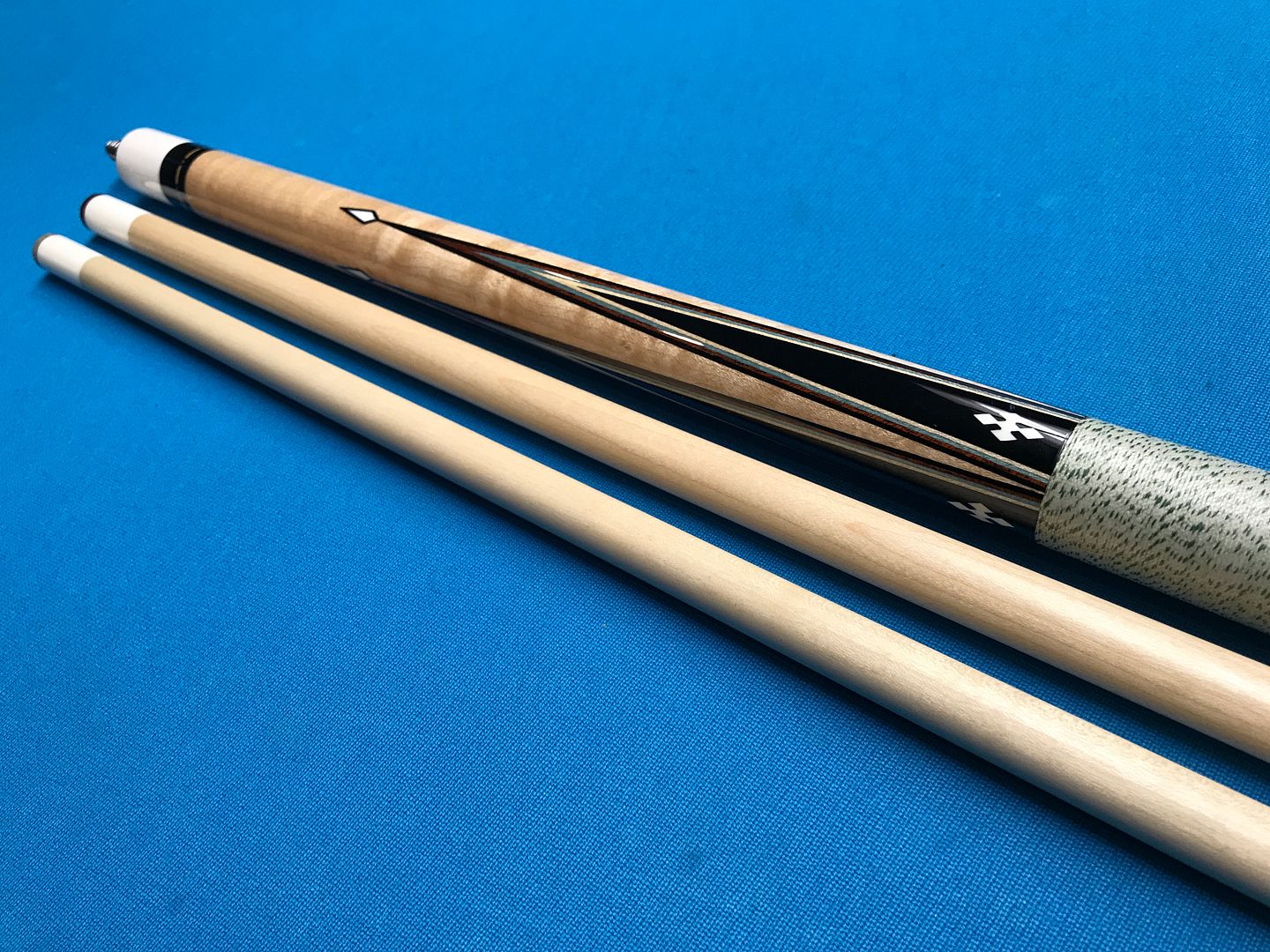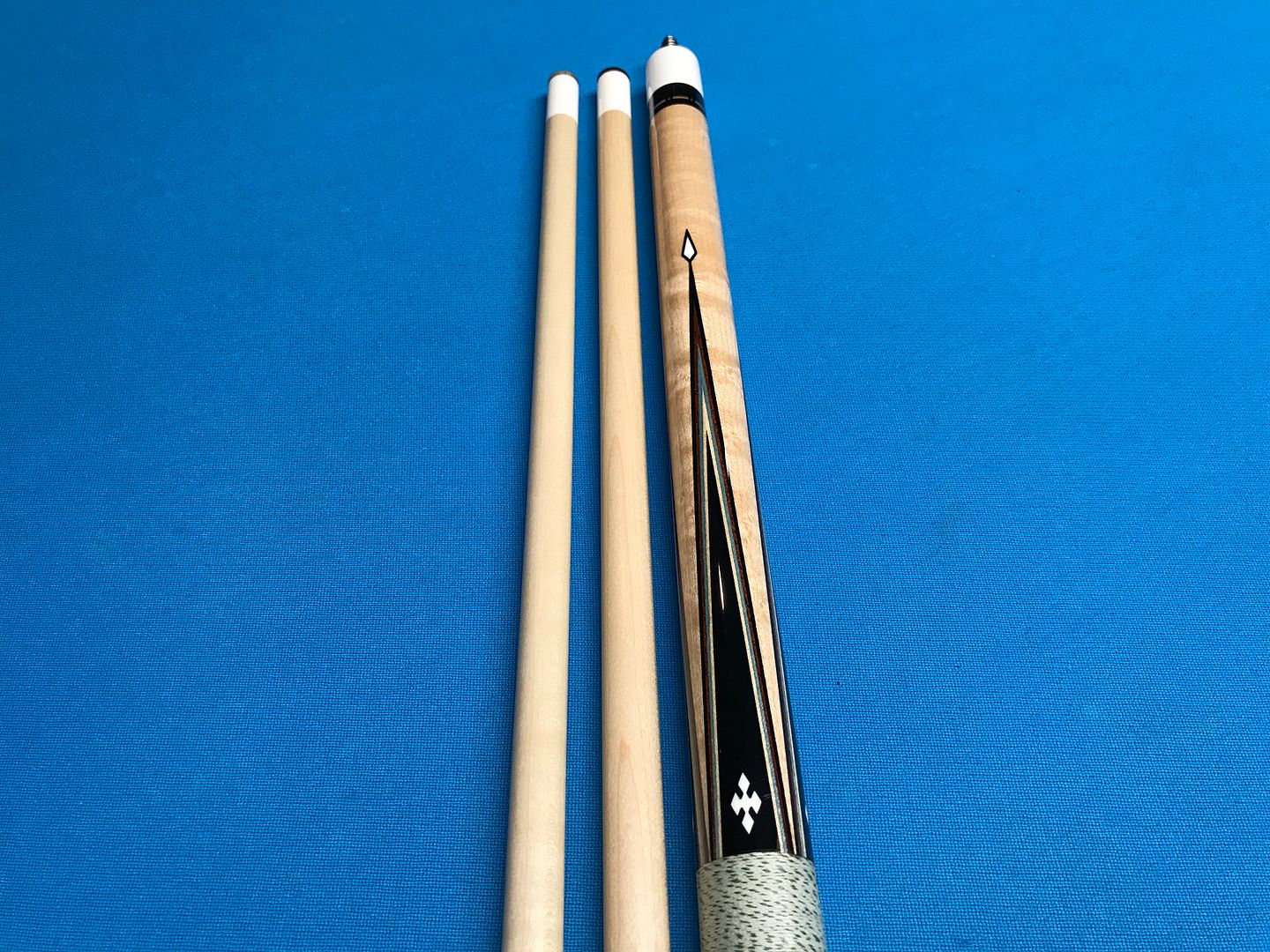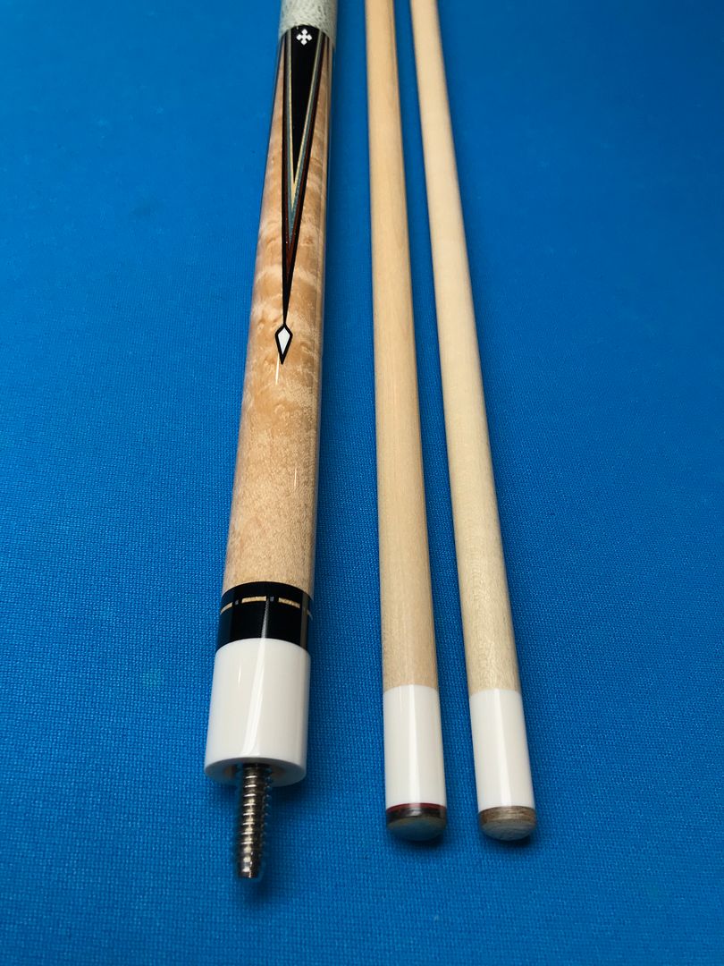 The cue is 59 inches with 4 Ebony points into Birdseye maple. The veneers are black, mahogany, blue, and white. The cue has ivory inlays and a piloted ivory joint. The butt cap is delrin. The shafts are 13mm (small taper roll) and 12.4mm (straight) with ivory ferrules. The cue weighs 19 oz and 18.5 oz with the smaller shaft.
