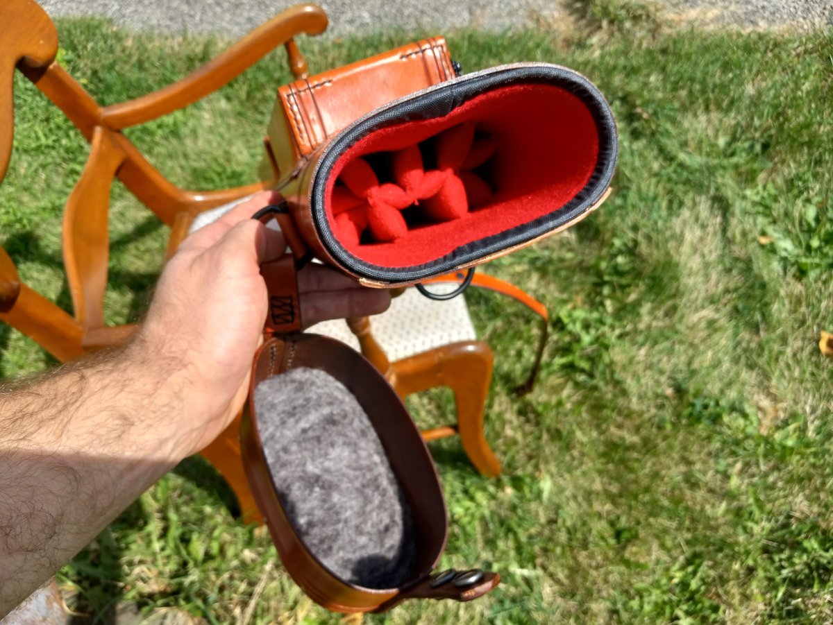 Comfort side handle, removable shoulder strap, 8" and 16" pocket. The tight fitting lid is secured by double snap closure and is lined with real wool, which we felt in the shop.