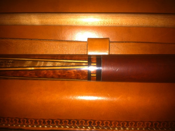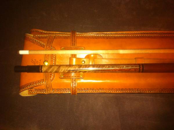 Cue is Bastogne Walnut forearm with Waterfall Bubinga Butt and Points, cognac Kangaroo warp from Martin at (lwww.superiorcues.com), a “5/16-14 Piloted Water Buffalo Horn Joint,Ivory Ferruls and the shafts are sunken wood from Timeless Timber from Sunken Maple.