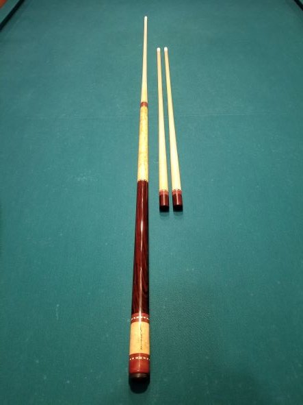 Custom made and balanced--Butt 28 inches incl bumper, 2 shafts 29", shorter ferrule shaft 27 5/8". Full cue either 57" or 55 5/8" depending on shaft used.