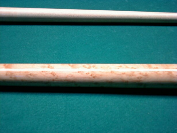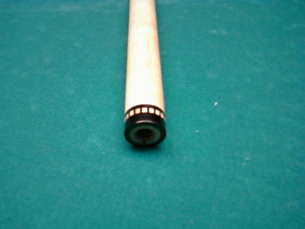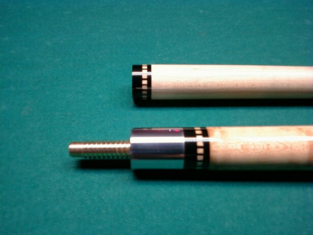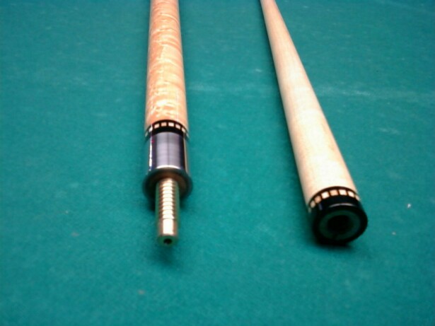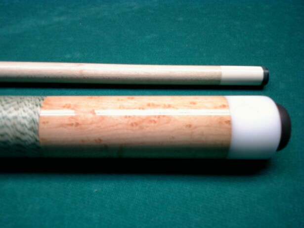Here is one I just finished up the other day. The wood is from Hangemhigh, all of the old growth Maple. This cue is a tribute to a JW a buddy of mine has. This cue also features my first metal joint ( yay ). Birdseye maple front, Birdseye maple butt sleeve. The handle is some old Maple from Hangemhigh, two old growth shafts. Both shafts have Ivory ferrules and Emerald tips. Irish linen white w/ green spec wrap, 3/8-11 brass pin, flat faced joint. Stainless steel sleeved over phenolic. Delrin butt cap. Both shafts are 13.25 and the cue weighs 18.3 oz. I now have a new player. Thanks for looking, any advice would be appretiated.