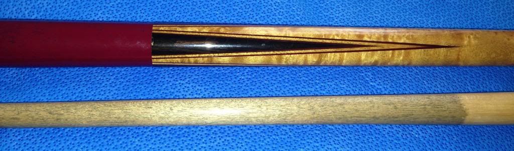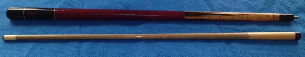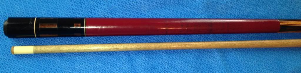 i have to say this cue is quite cool.. it has an original leather wrap.. basically seamless! well almost.. anyways.. i will let the pictures i took with my iphone do the talking... its no where near perfect, it has some dingers and bumps.. but the butt is straight as an arrow, the shaft is alittle thin (for me anyways) and seems to have a roll in the middle but the ferrule and collar never leave the table.. its hard to tell.. needs to be cleaned.. but it may have an ivory ferrule.. and weighs 3.9 ounces!