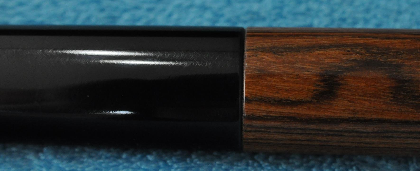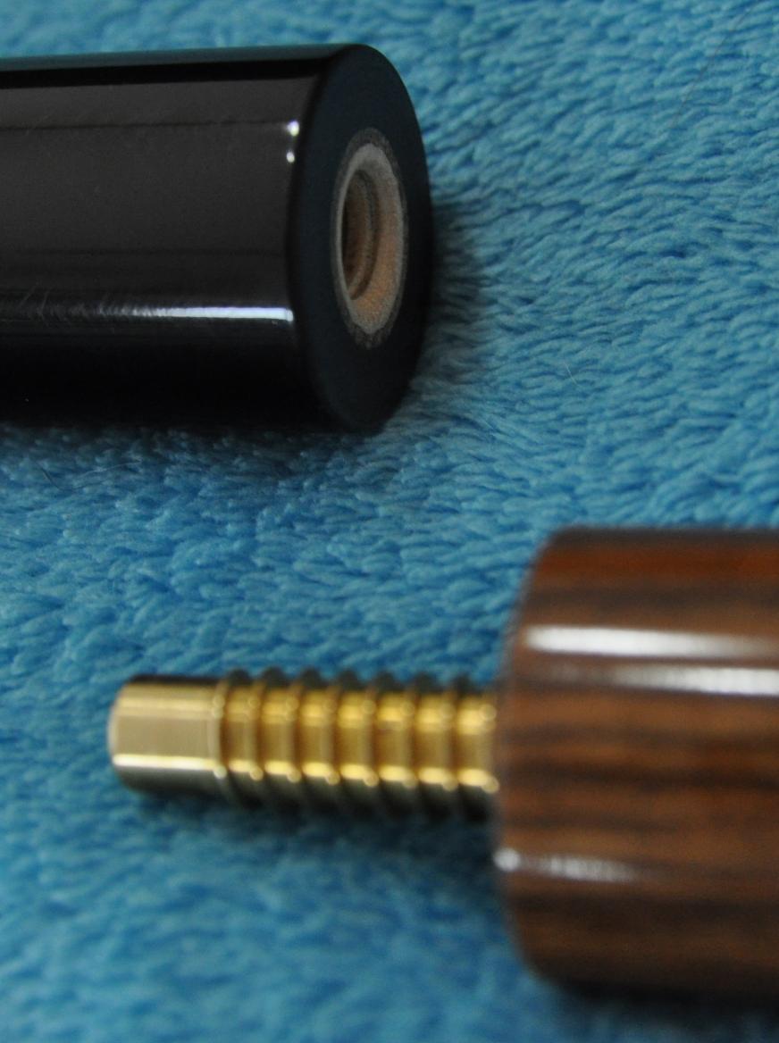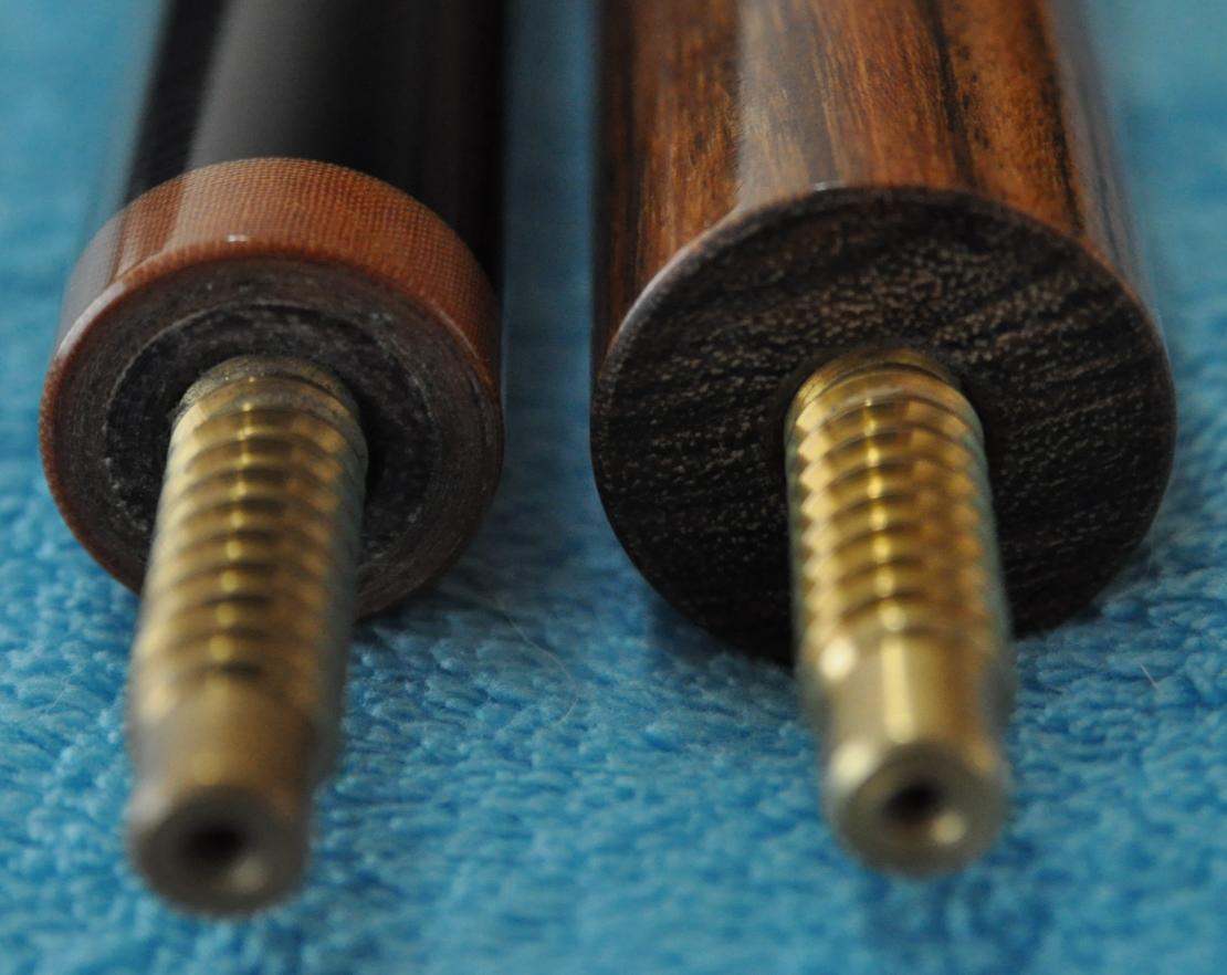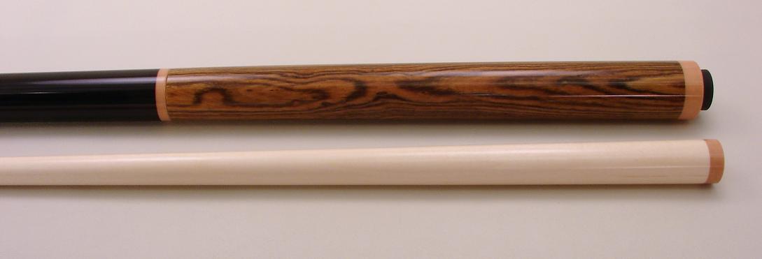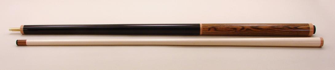 This cue is 58" and a beast at 21oz with no weight bolt...could be made a tad heavier if desired. Trust me...this cue explodes the rack with minimum effort... The shaft is a very dense 13.3mm and features an unbreakable brown phenolic ferrule and Kevin's black canvas-resin tip. You can tell from the pic that this tip really holds chalk well. *The wood combo needs a bit of explanation...the rear of the cue is mexican bocote...the forearm is purpleheart. It was just an ugly color tone of purpleheart so It was dyed black...it looks just like jet black ebony now. Immediately after I bought it, I had the jump joint re-worked so instead of it being a brown micarta ring, it's now Black phenolic sleeve that's about indestructible. Both pins are the big fat SW style, brass 3/8-10. Cues are signed Varney - 2009. If you are looking for a mans j/b & you don't suffer with a weak elbow...then here is the cue for you. I promise...when you break with this cue others near you will stop & take notice. Pics don't do this cue justice...its really stunning in person. The cue is ready for immediate delivery. Thank you for looking