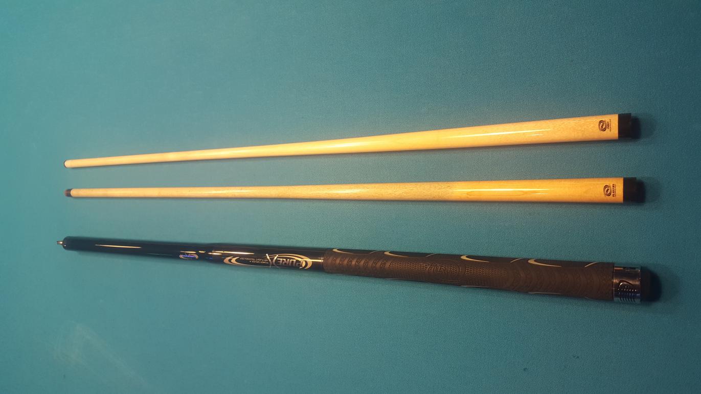 Second cue- Players cue w/ HXT shaft. Have used this as my backup cue, and will pull it out when the wife comes out to play. Perfectly straight with very minor wear. Wrapless, 3/8x10 joint, 19 oz, 12.75mm, Moori tip.
