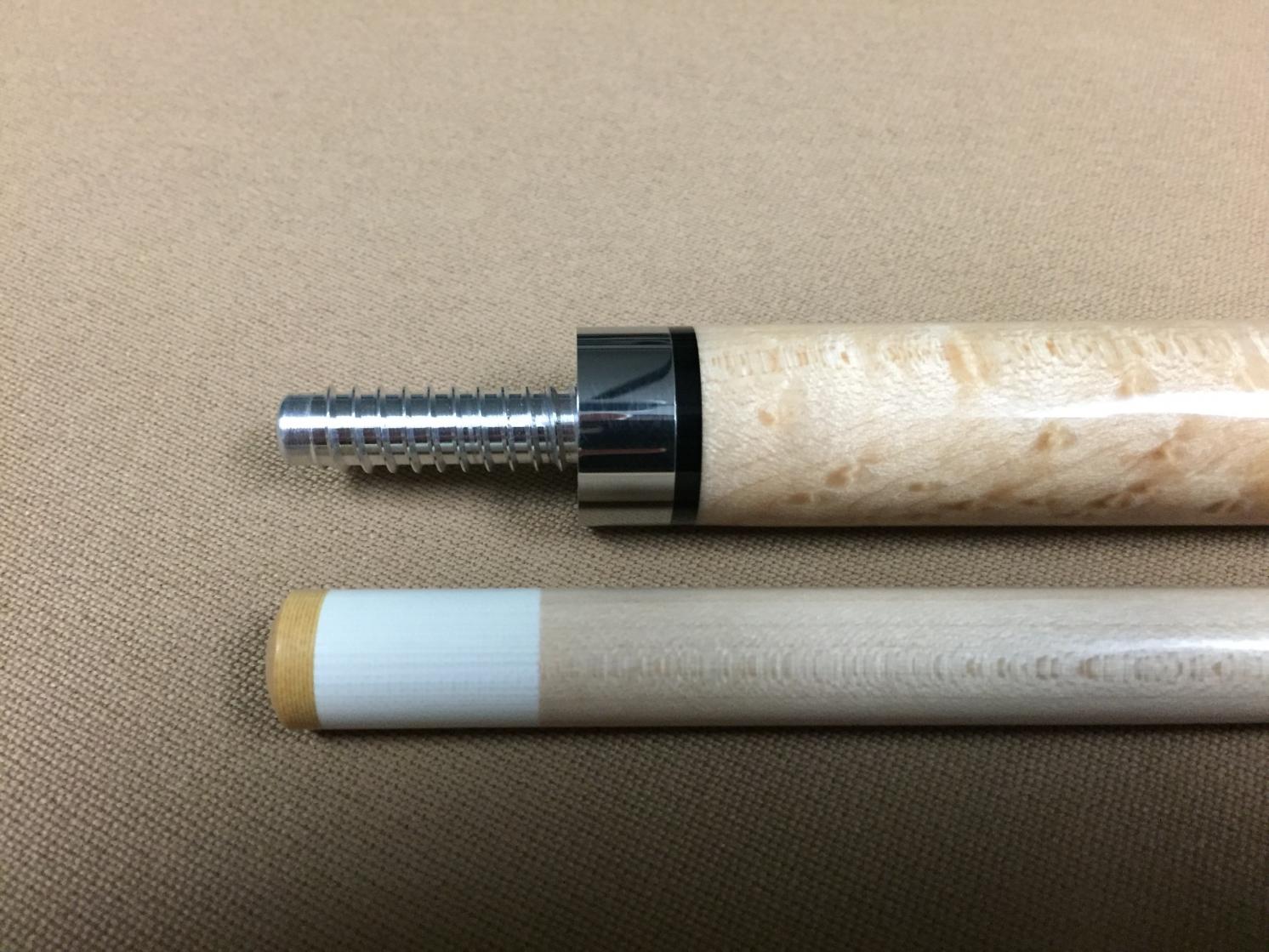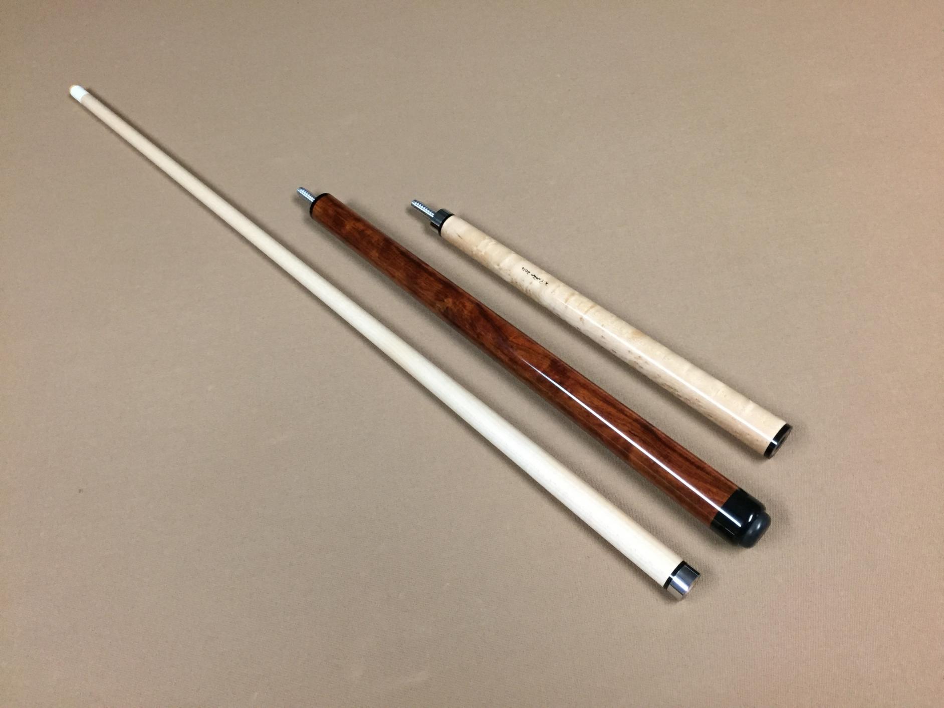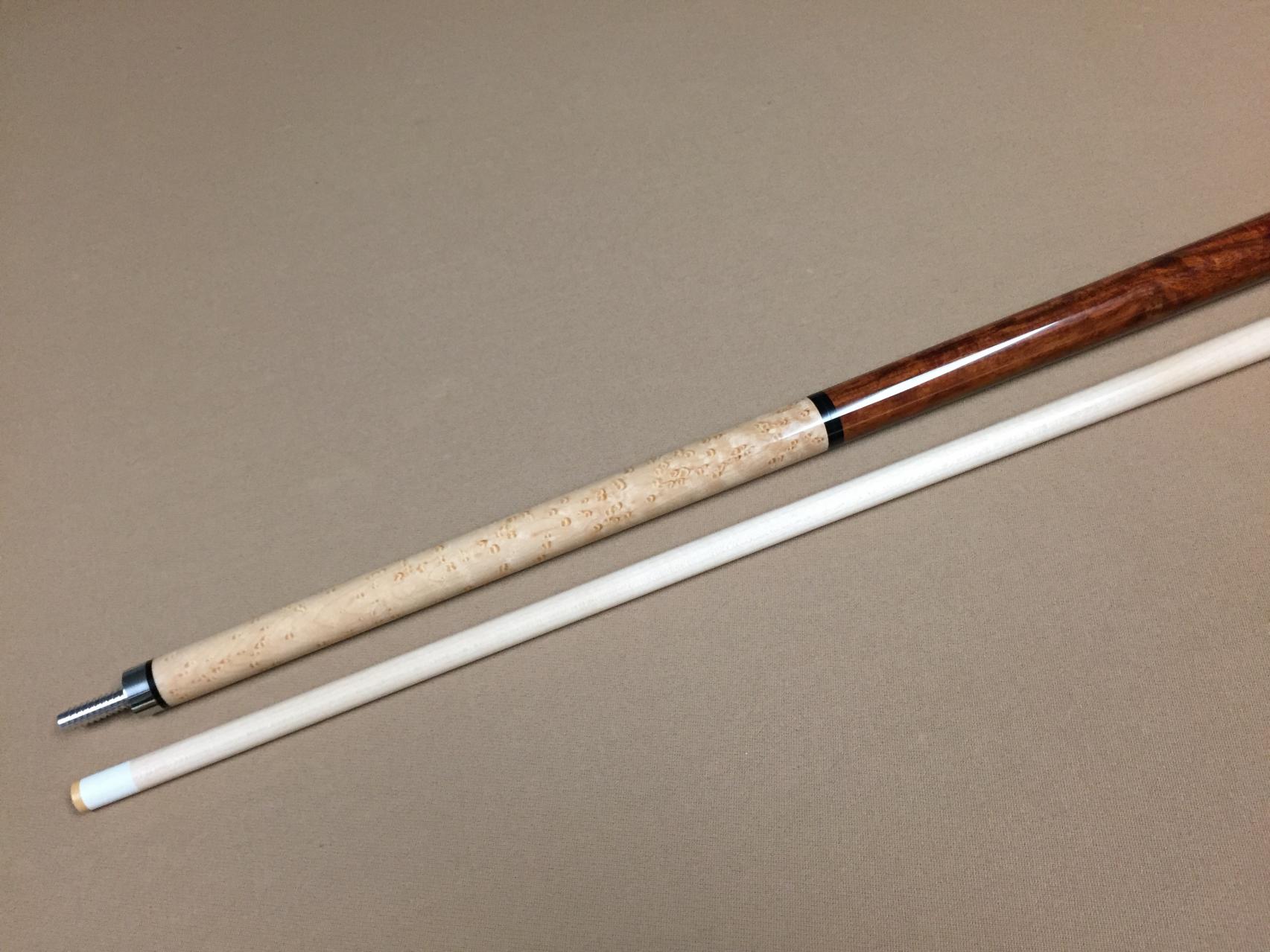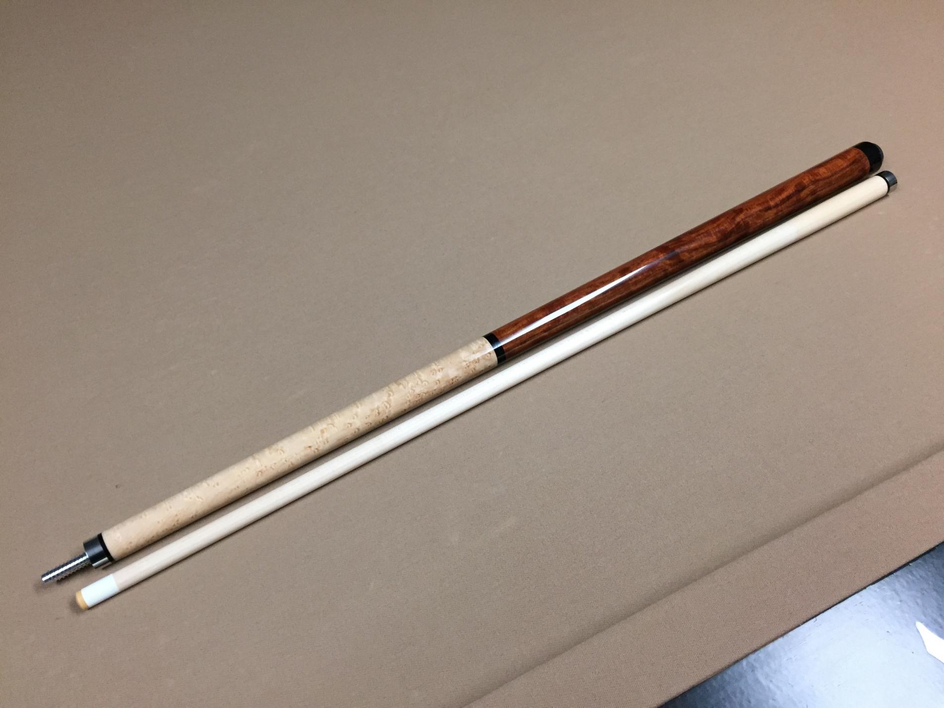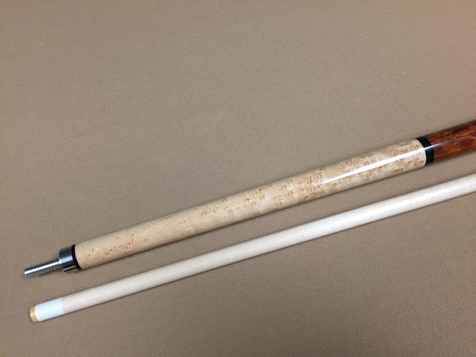 For your consideration is a true custom made jump / break cue in like new condition - ($75 below retail). This cue was made by Kelly Peterson, owner of MVP Cues. It is one of a kind. I bought it from Kelly and used it a for a couple of weeks. Then I decided to buy another one of his jump / break cues, that he had just finished, which matched my main shooting cue a little better. That is why I am selling this one. It is a very solid hitting cue. It breaks extremely well and it jumps better than any other jump cue that I have tried. If you haven't tried one of his cues, Kelly's work is top notch. Not only is the workmanship outstanding, but he uses beautiful woods that are not usually found in cues anywhere near this price. This particular cue is made of grenadillo for the butt end, with a highly figured birdseye maple forearm, and a maple shaft. The maple shaft has straight grain with an Ivorine IV ferrule and 13 mm White Diamond tip. The joint is half size stainless steel with a modified 3/8 x 10 aluminum pin. The second joint, at the butt end, is a quick release 3/8 x 10 modified aluminum pin. The weight of the cue is adjustable between 18 .1 and 18.9 oz. Paypal Only - Fees included. Shipping is free via USPS to the lower 48 only. Thanks.