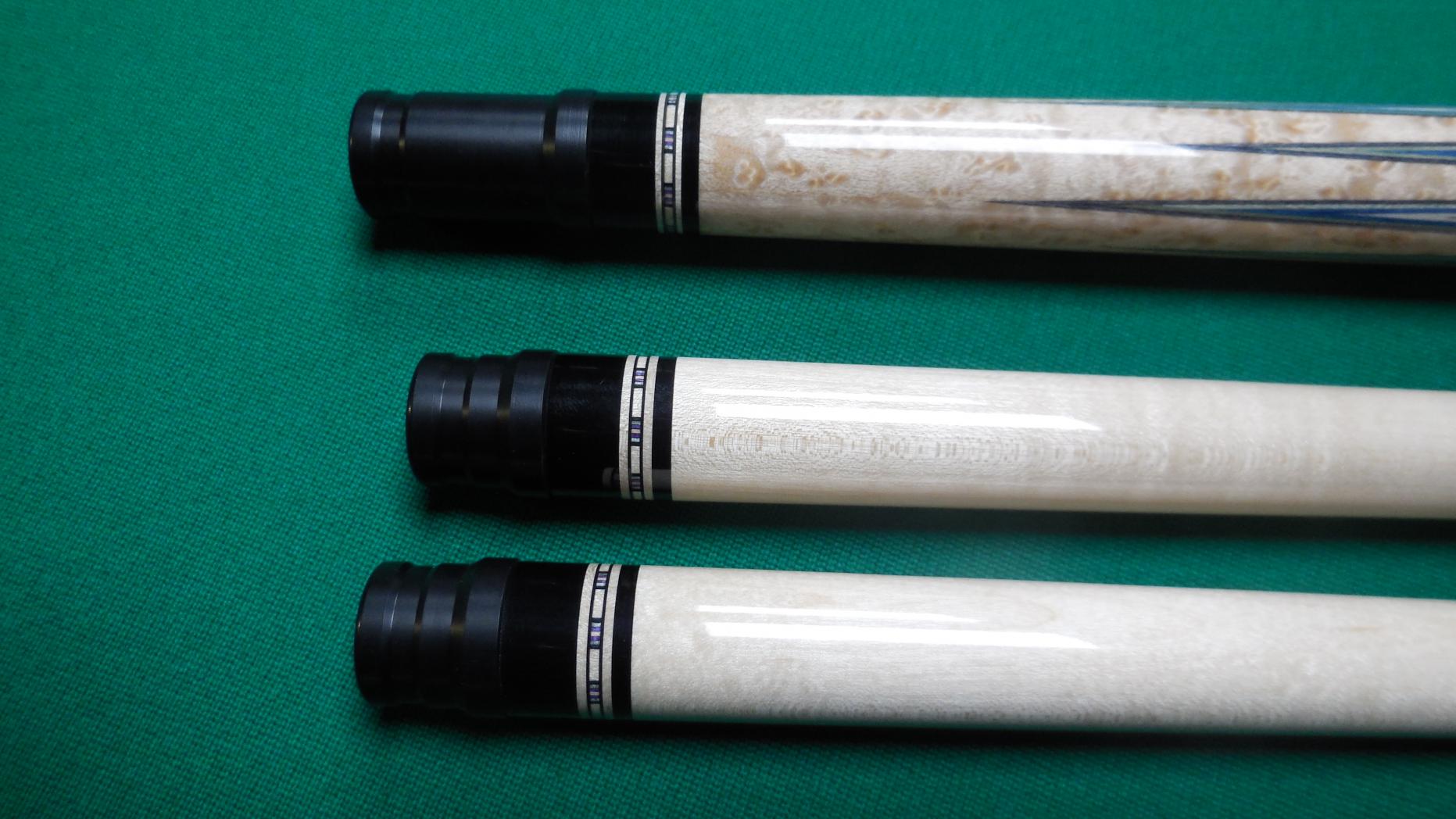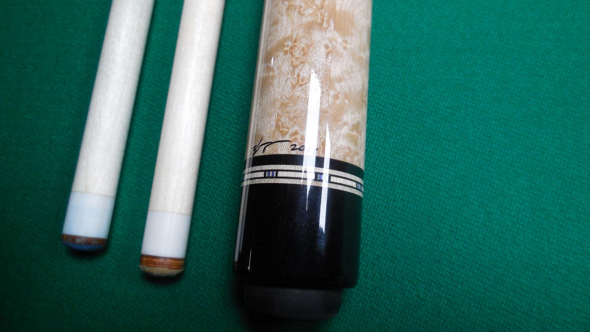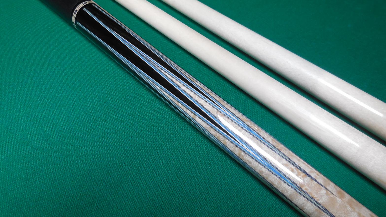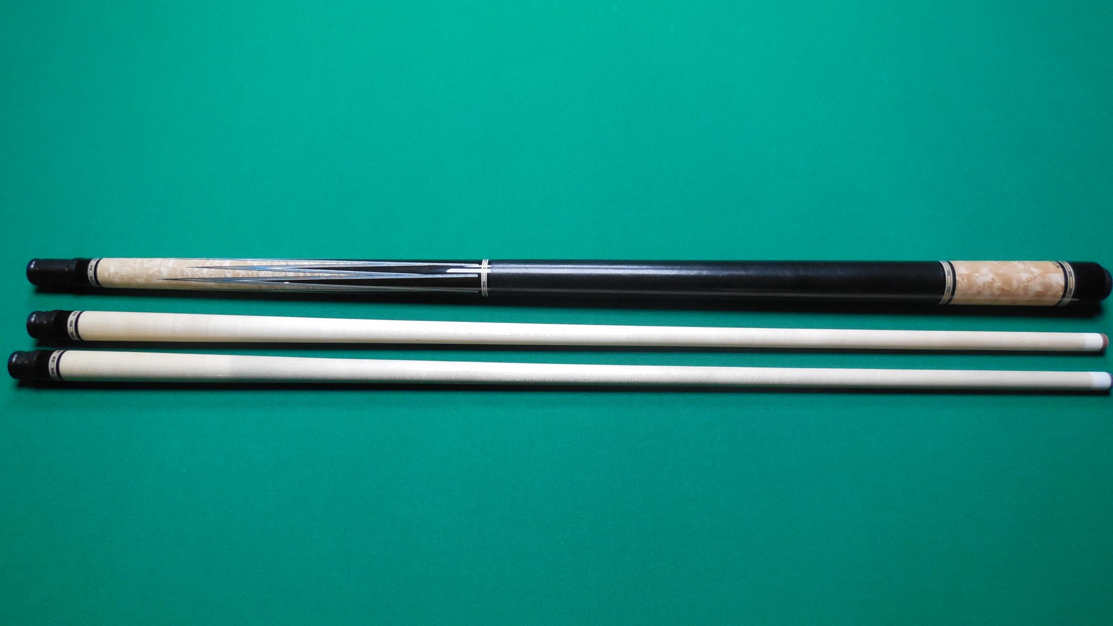 Kent Davis built in 2017 laminated BEM forearm/butt, 8 Ebony points w/4 veneers, leather wrap by Tim Prince. 2 shafts one light use one unchalked Moori tips. 19 oz, 12.9mm shafts. 3/8 -10 brass pin. Cue is in excellent condition. leather wrap probably has less than 5 racks.