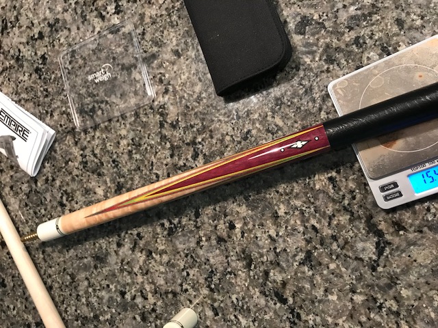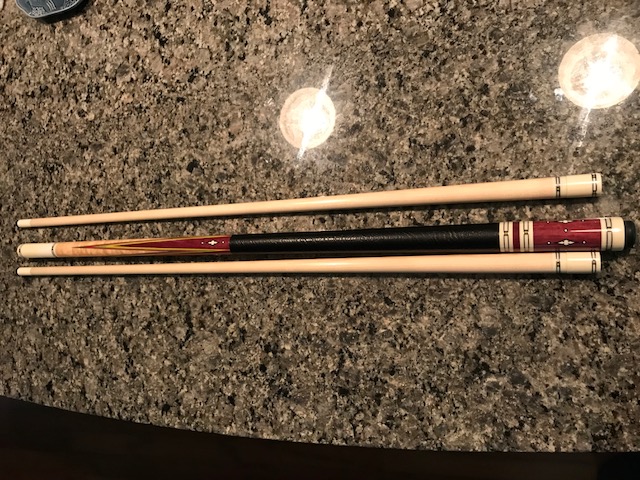 Great playing cue!! Purple Heart and maple with all the good stuff. 59 3/4" long.