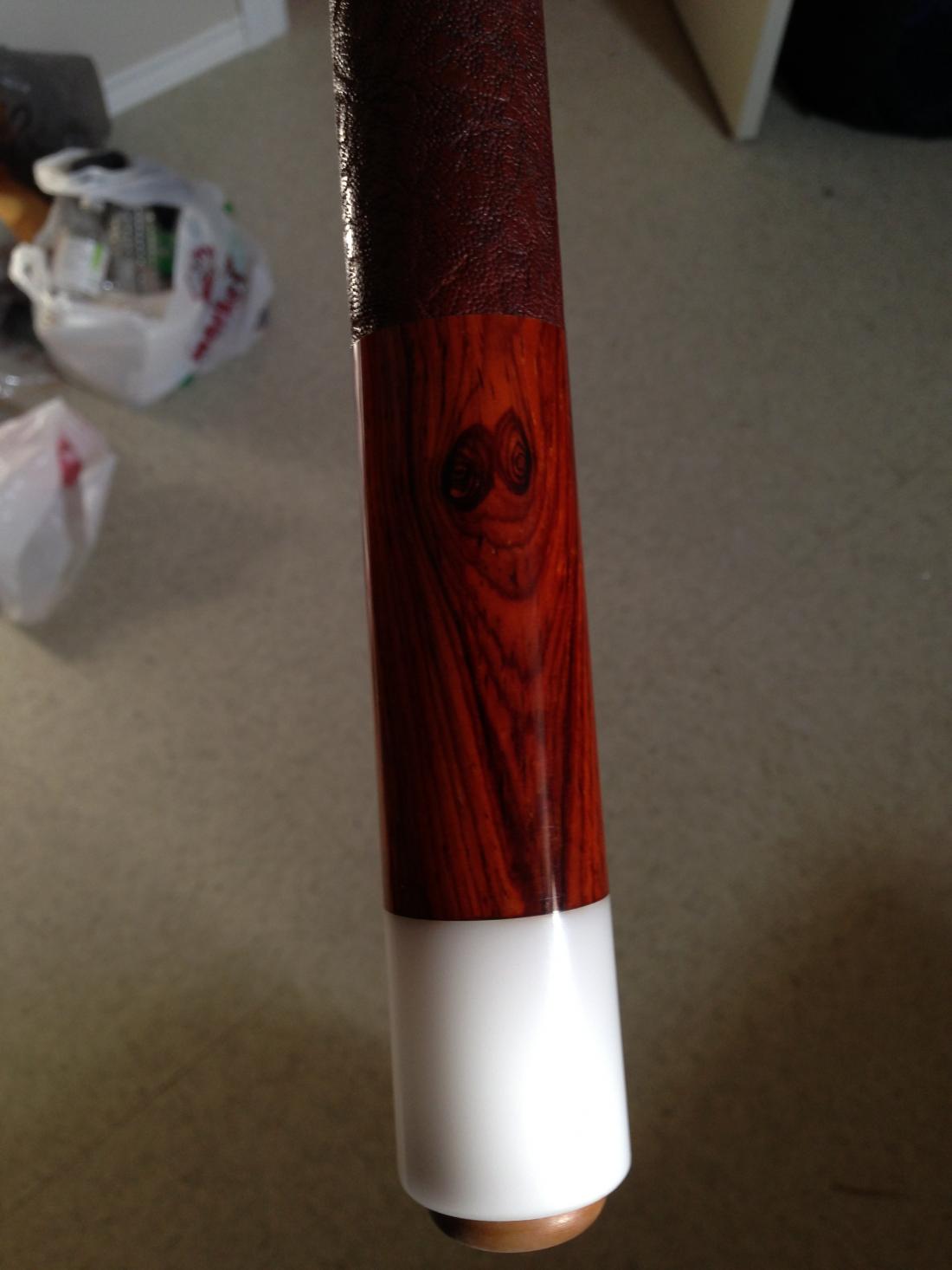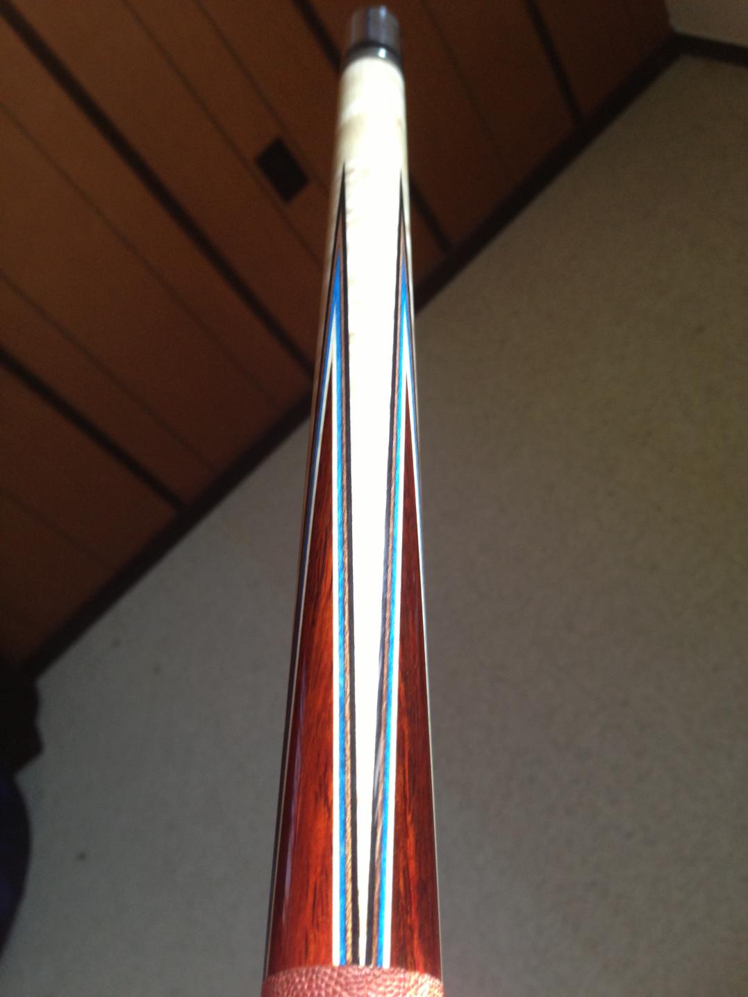 That is a nicely executed cue. The veneers work well. Klein currently has a 2 year waiting list and only does about 2 dozen cues a year. I got on his list a while back because I have been impressed with his fit, finish and reputation.