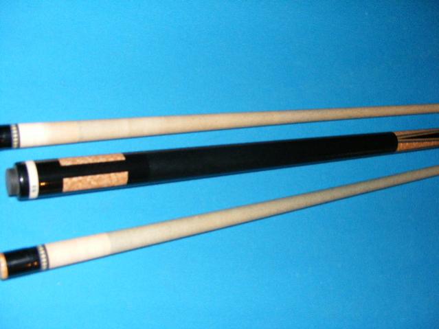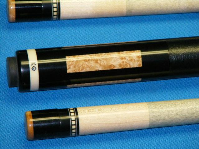 KQ cue has titlist points reversed ebony nose birdseye points has 5/16x14 ivory joint ivory ring birdseye windows in butt 2 shafts both 13mm with ivory ferrells weight is around 18.5oz great hitting cue Im asking sold