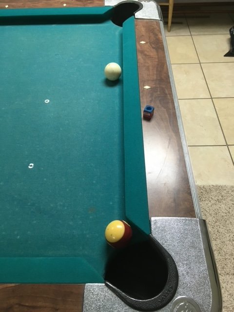 (e) the ball rests within the corner pocket and past the nose of the head cushion.