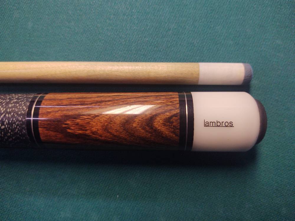 Vintage Lambros, flat face 3/8-10 joint, Delrin butt, Cocobolo sleeve, stained birdseye maple forearm, black/white spec Irish linen wrap