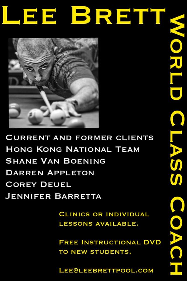 Who is Lee Brett? He is a World Class Coach & Author of “The Secret Art of Pool” Some of his current and former students are the – Hong Kong National Team, Darren Appleton 3x World Champion, Shane Van Boening USA #1, Corey Deuel Former USA #1, John Morra Canadian # 1 and Jennifer Barretta to name a few. http://www.leebrettpool.com/