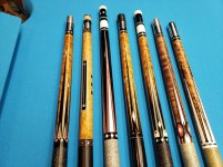 Did Bill ever say how many cues he built? I seem to see a lot more of the older 70's Era logo for sale. I would assume he made less later in his career because the artistry was so high and detailed. I also wonder if he did his own cabischons.[/QUOTE]