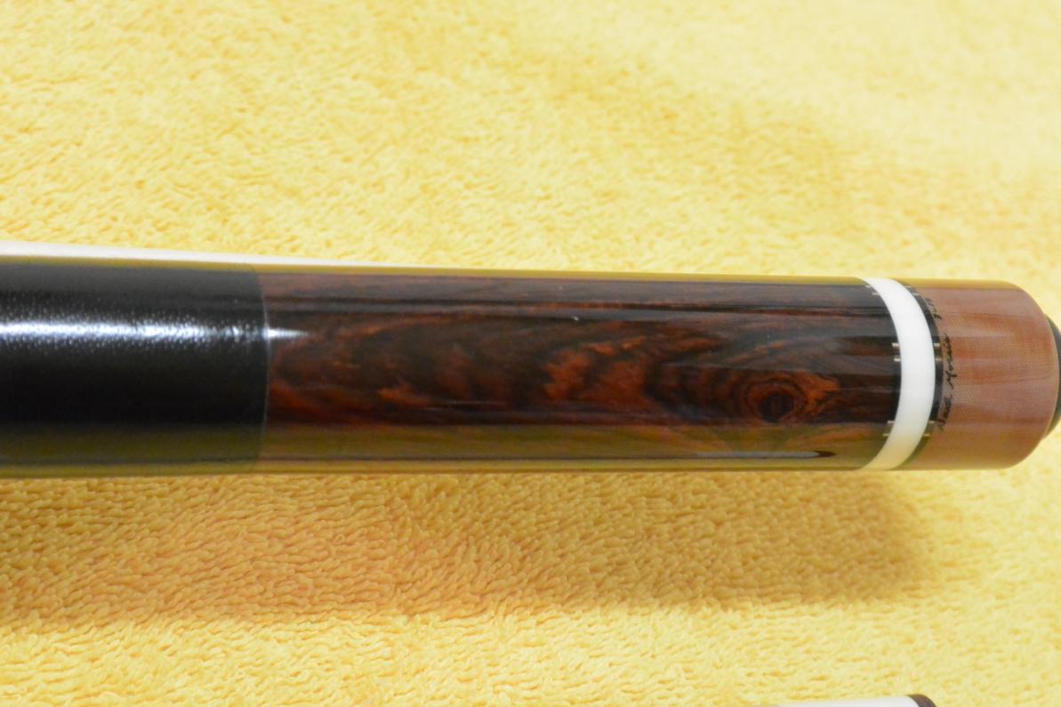 This is my other Ned Morris, it's a 4 point 3 veneer hoppe style player. The cue is Brazilian Rosewood forearm and butt sleeve. Sweet cue.