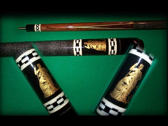 - Ebony forearm, four rosewood points with four colored veneers, ebony butt sleeve with figures inlaid in 14-karat gold within black chain link rings set in white at top and bottom.