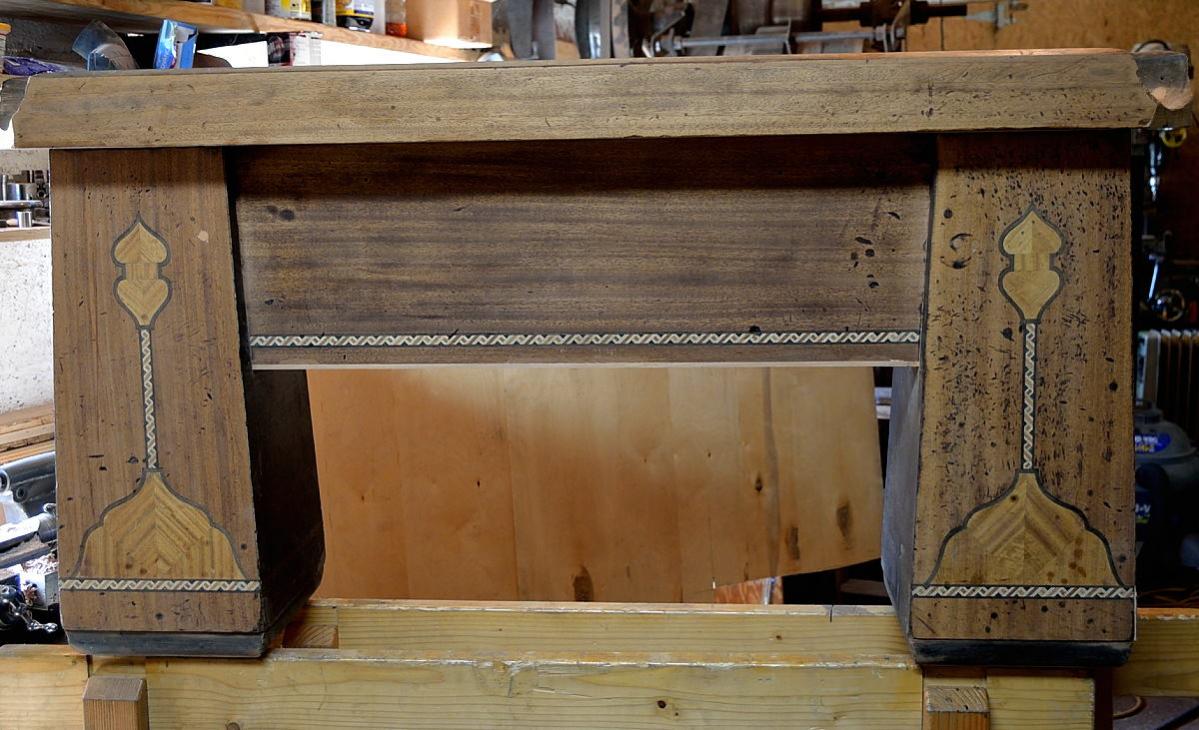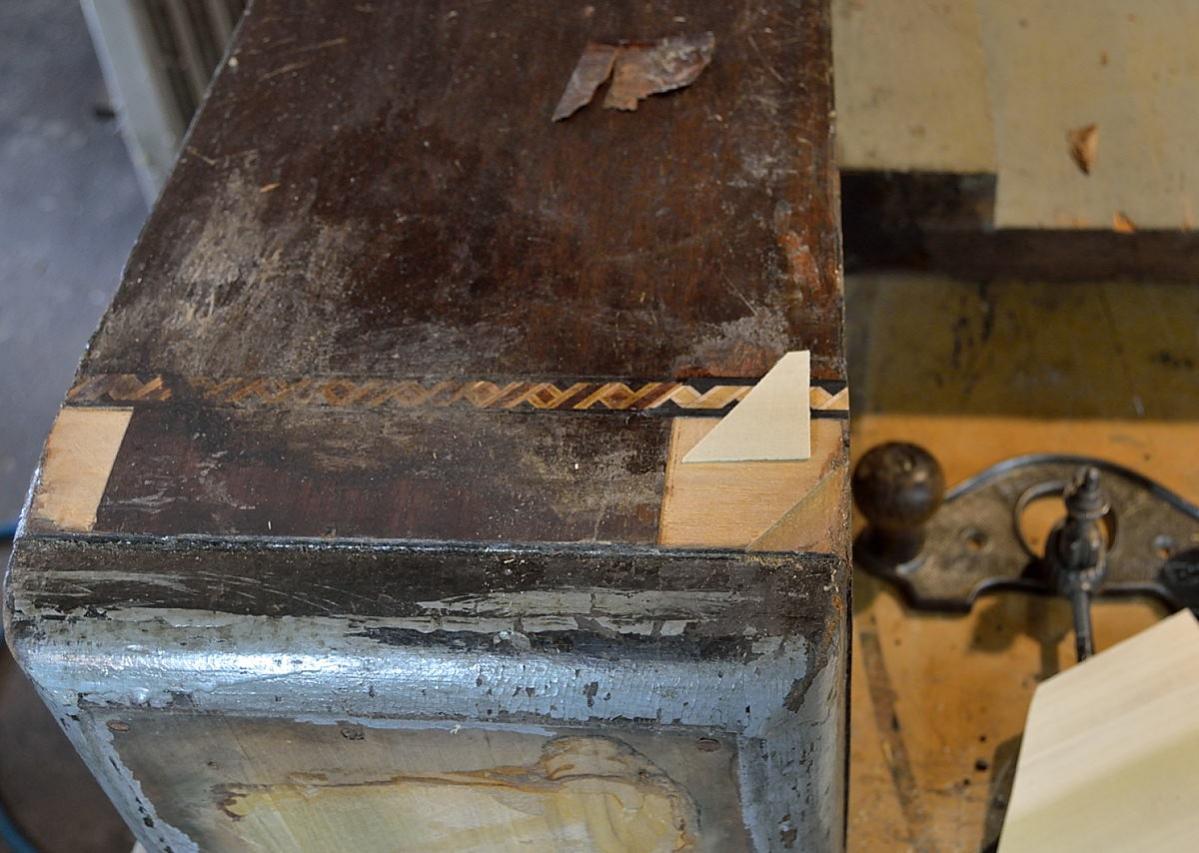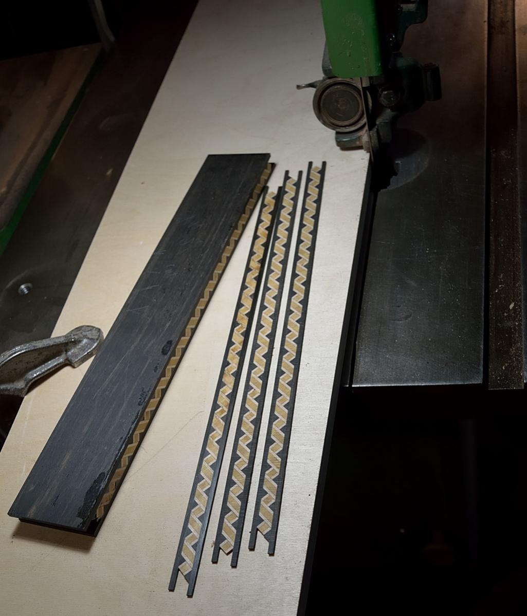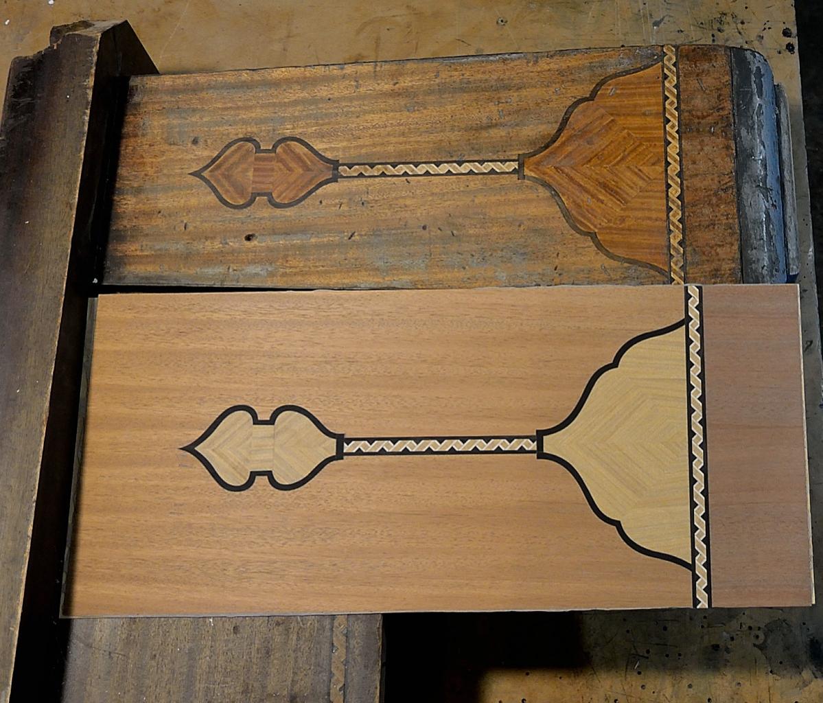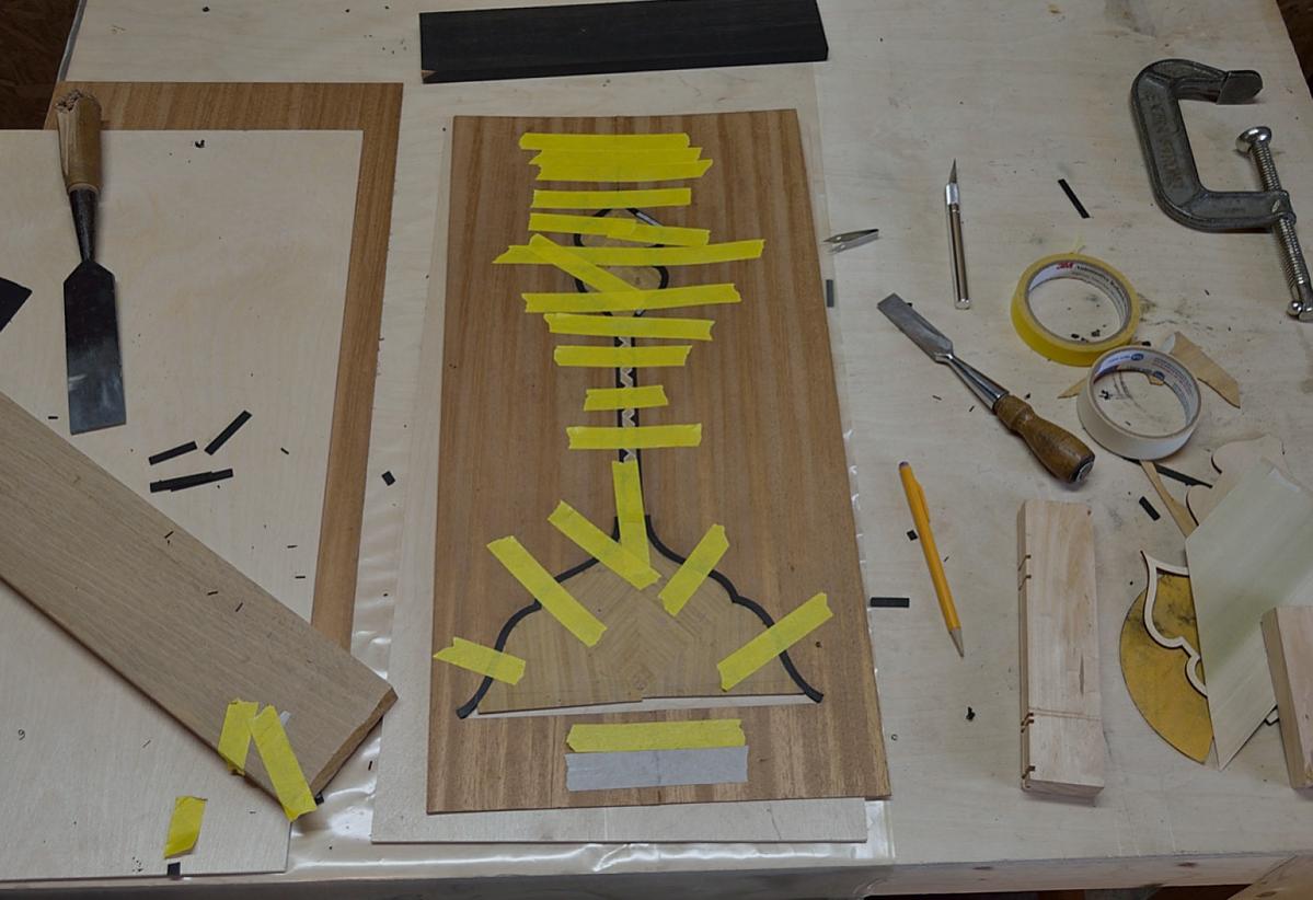 Back at my shop i cleaned up the parts, glued and taped them up, then 2-plied them onto poplar crossband, just like the originals. The banding blanks were made over a year ago, but only just sawed up for use. There's some errors in this that will jump out at anyone looking, but it's going on the table anyway.