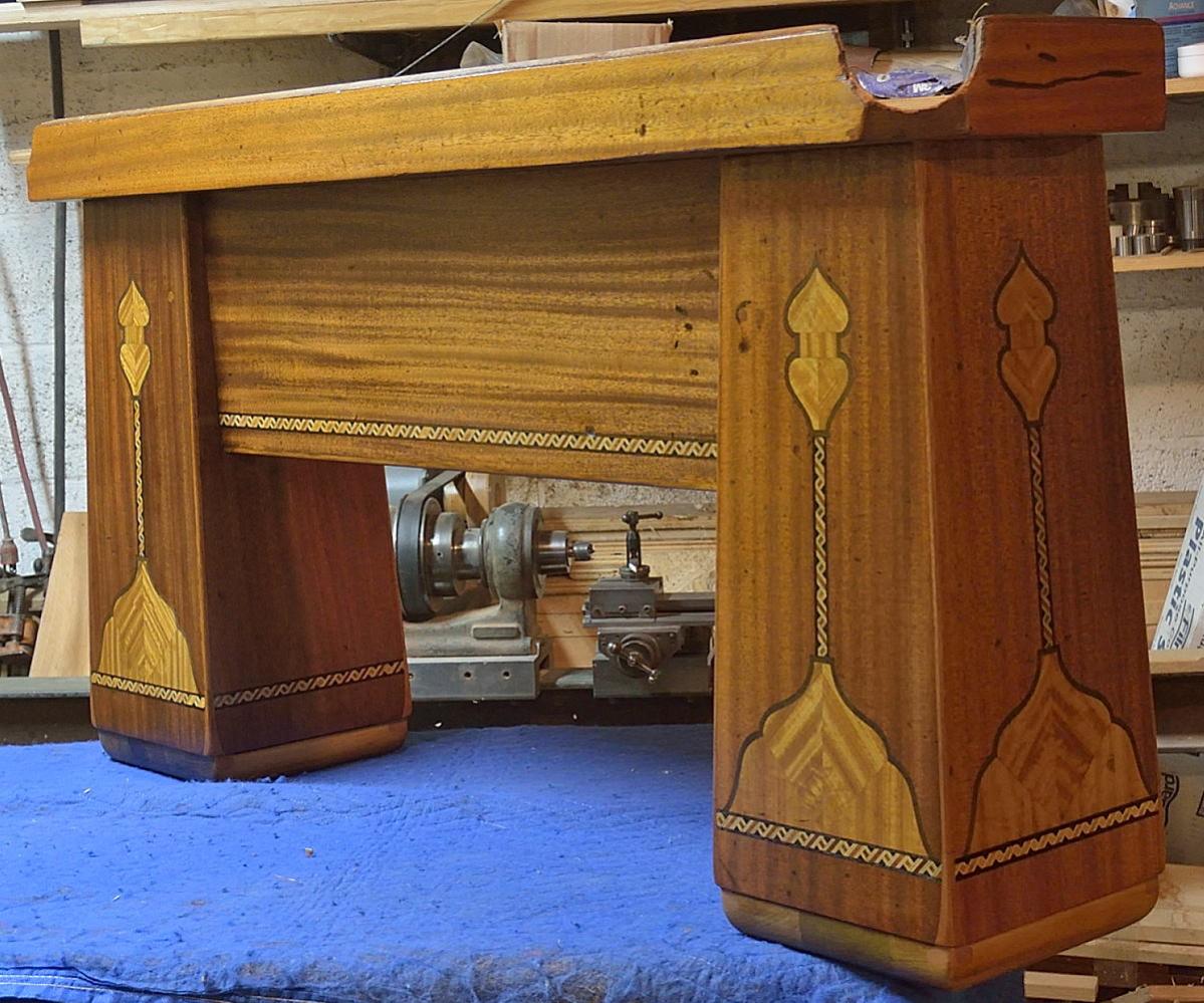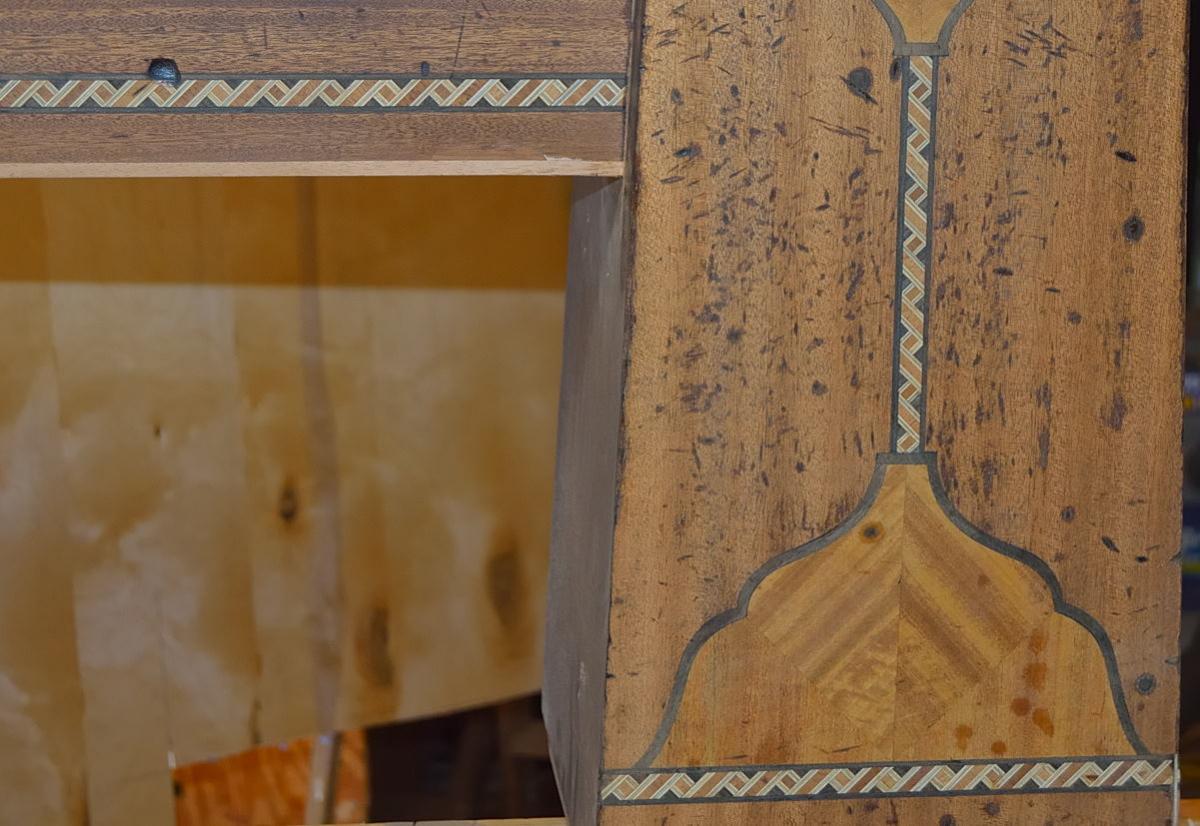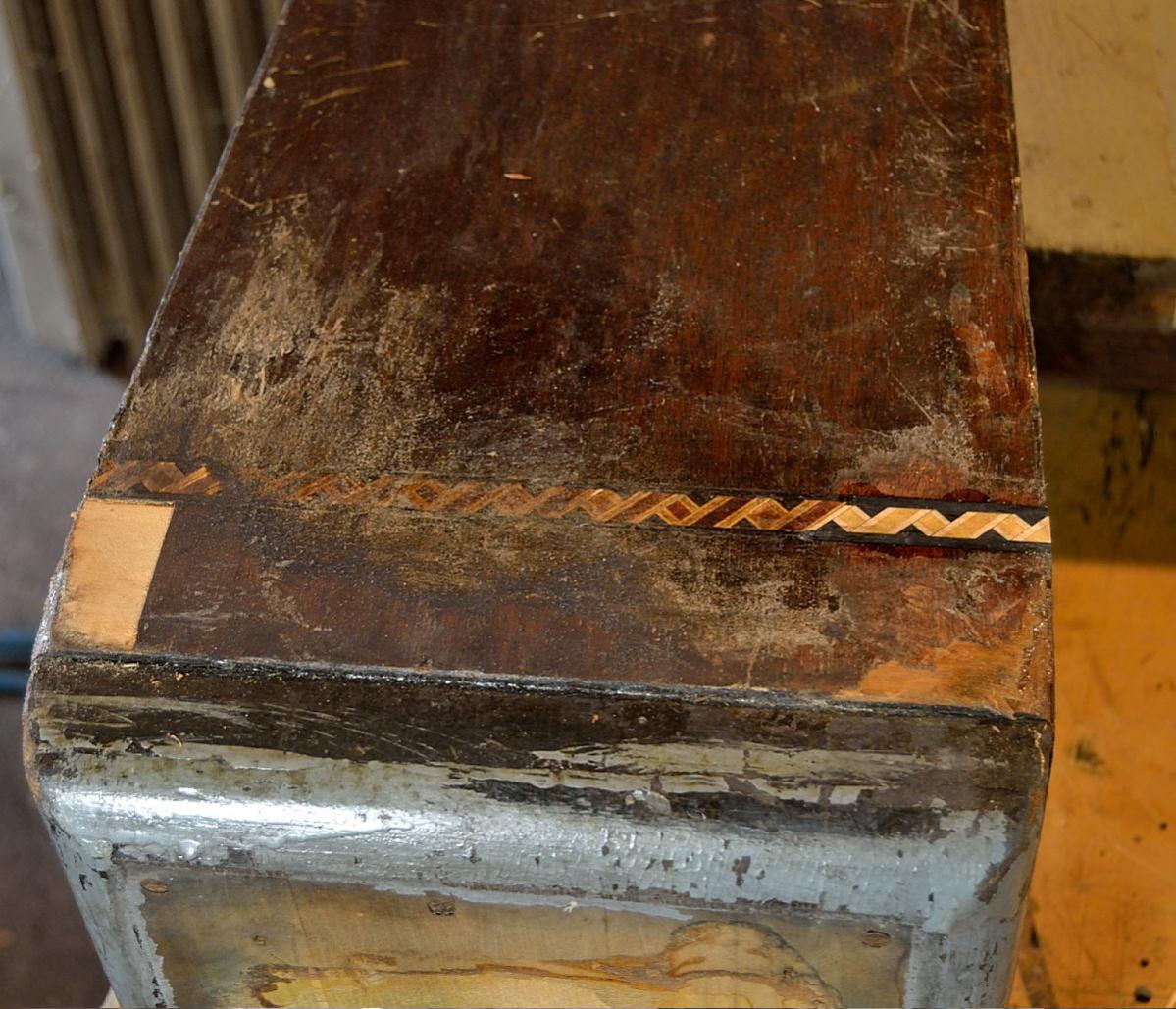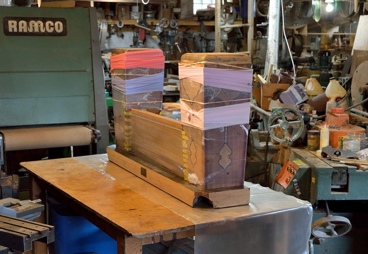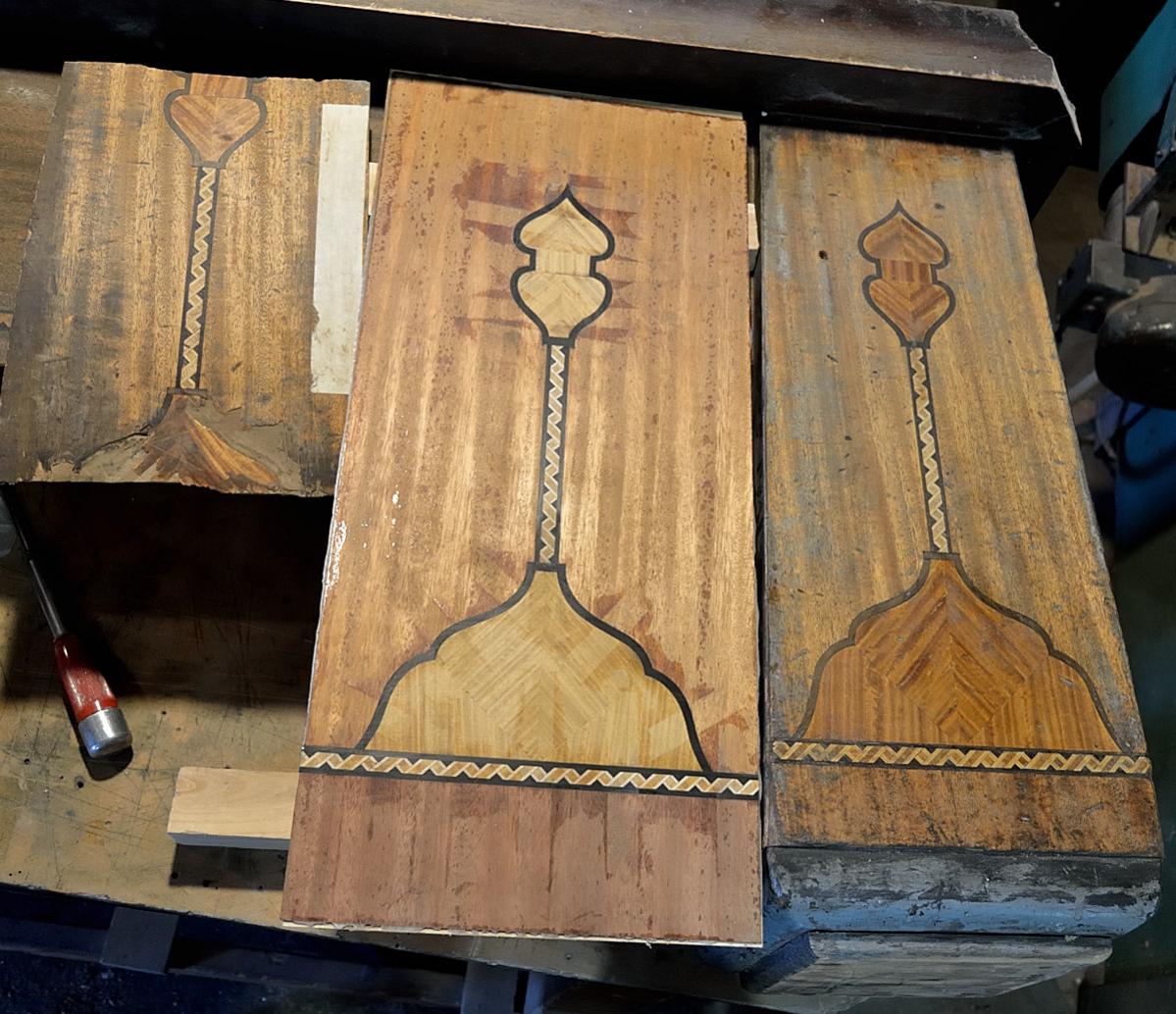 Back at my shop i cleaned up the parts, glued and taped them up, then 2-plied them onto poplar crossband, just like the originals. The banding blanks were made over a year ago, but only just sawed up for use. There's some errors in this that will jump out at anyone looking, but it's going on the table anyway.