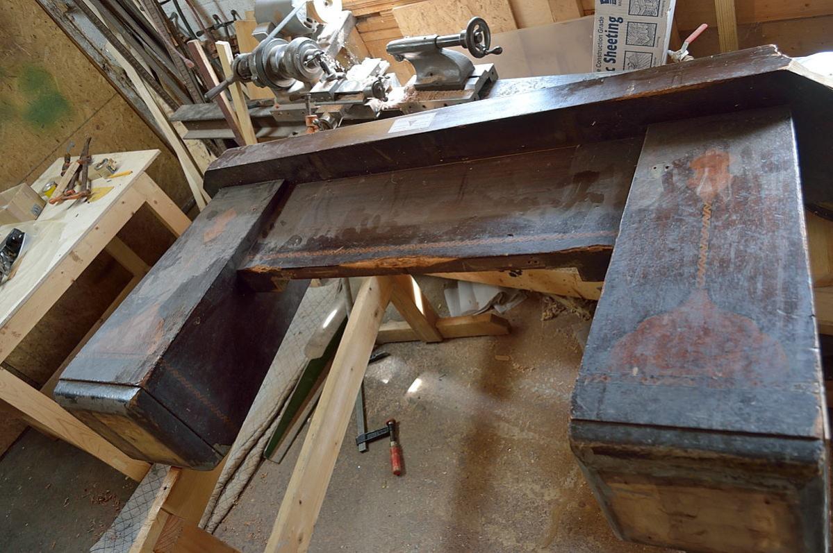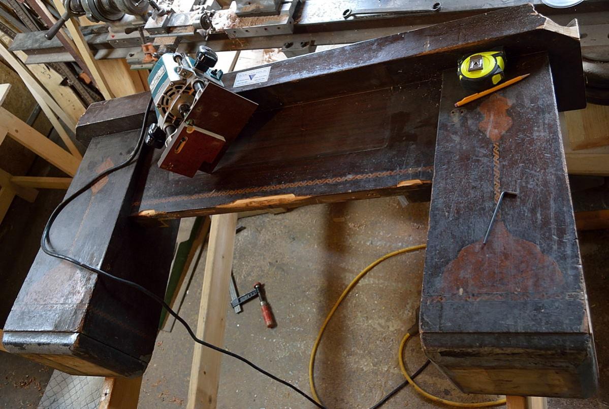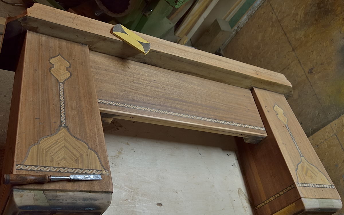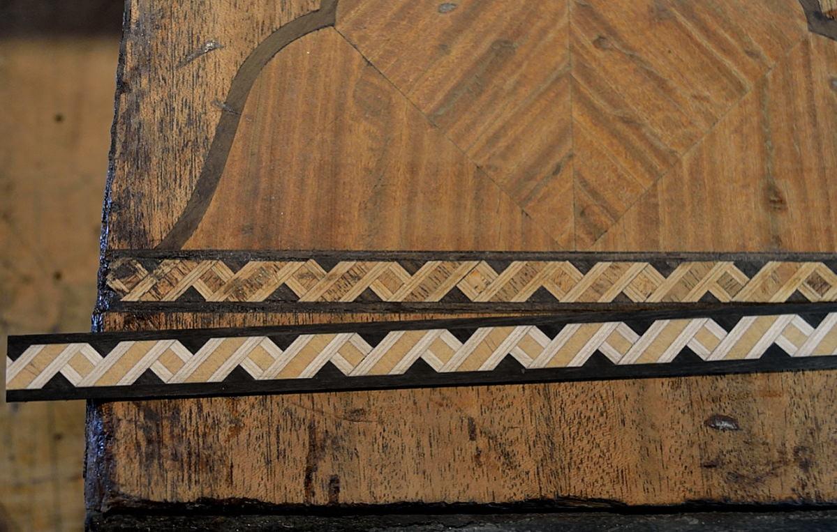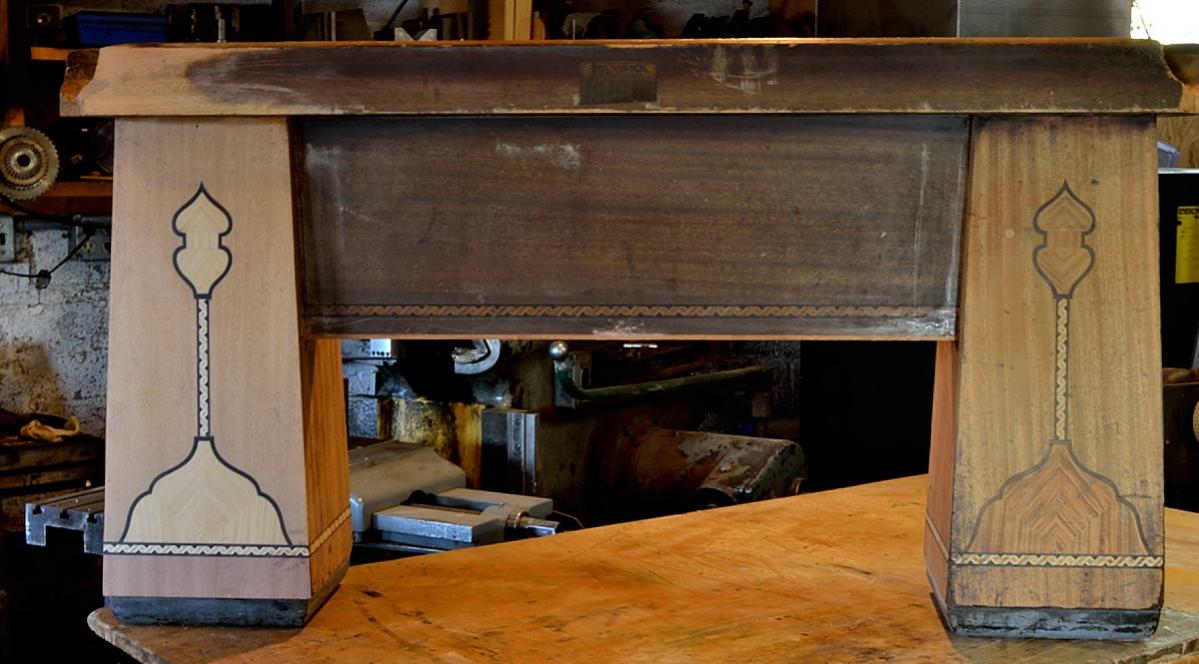 Back at my shop i cleaned up the parts, glued and taped them up, then 2-plied them onto poplar crossband, just like the originals. The banding blanks were made over a year ago, but only just sawed up for use. There's some errors in this that will jump out at anyone looking, but it's going on the table anyway.