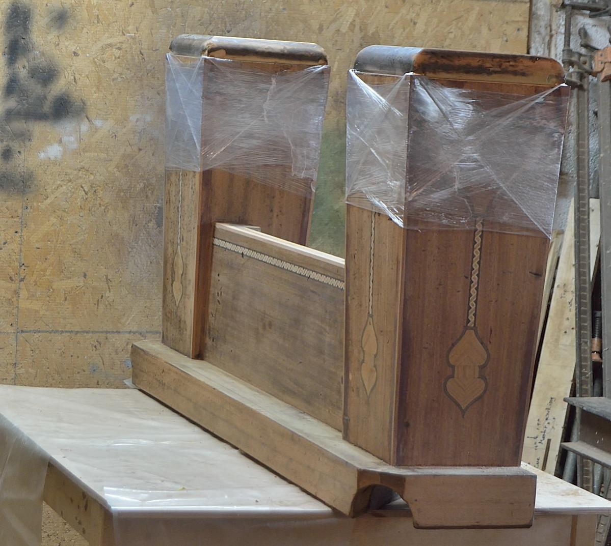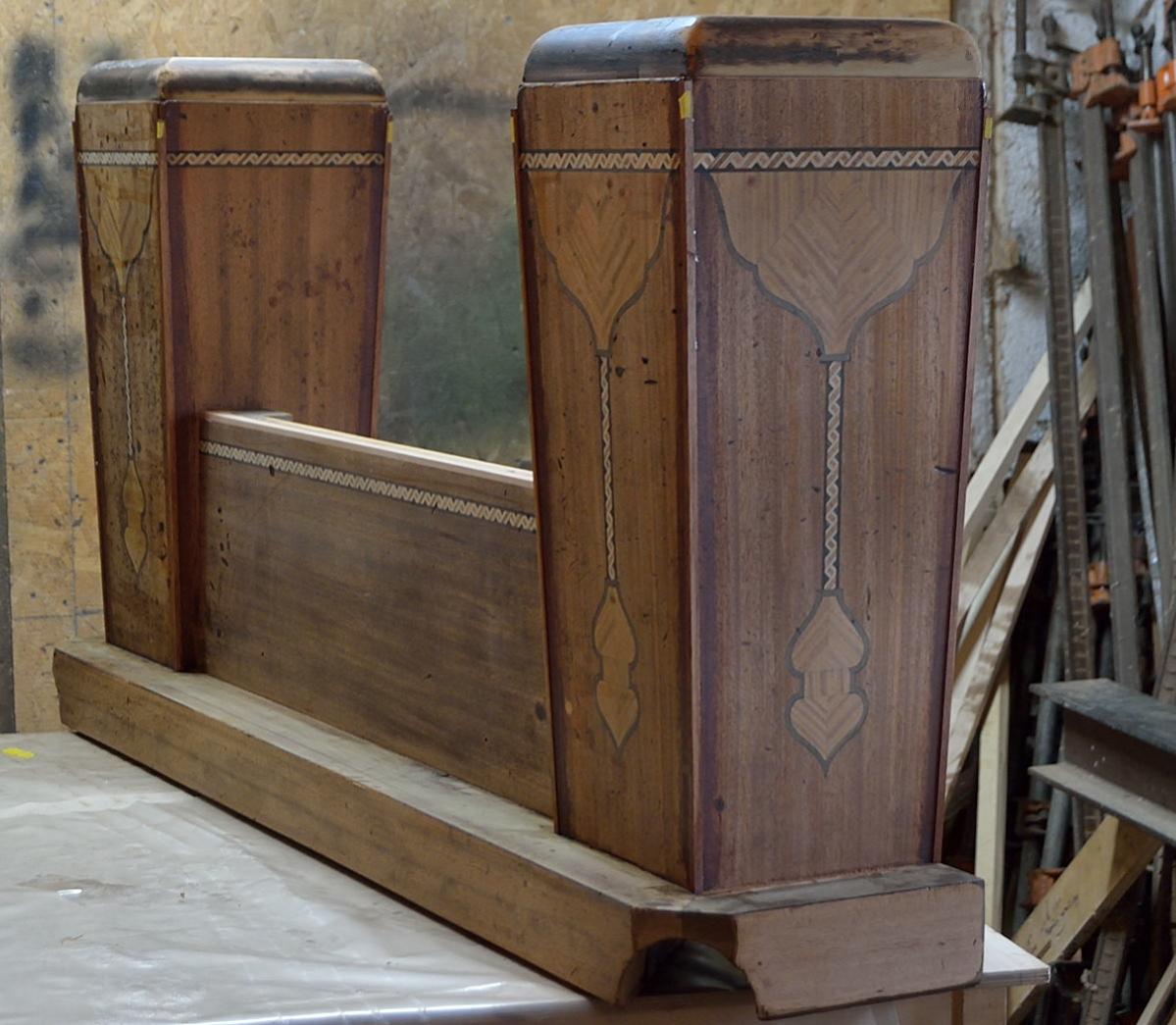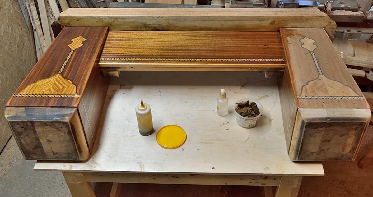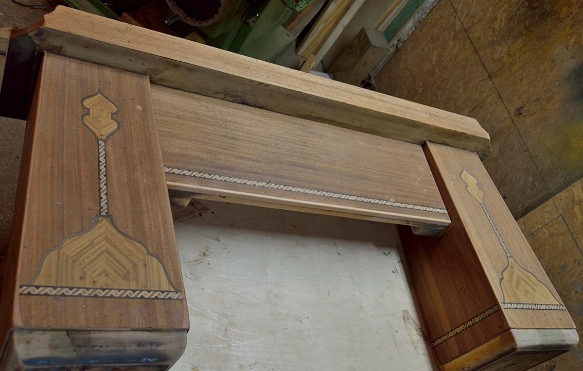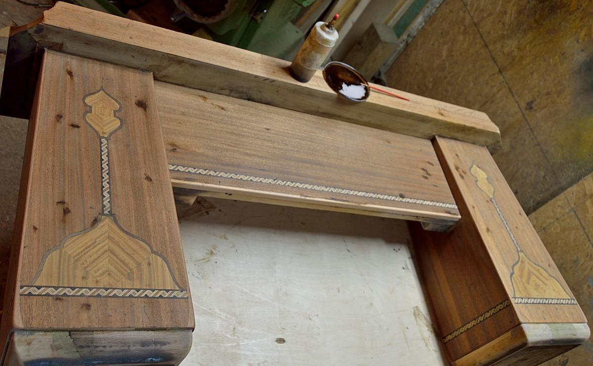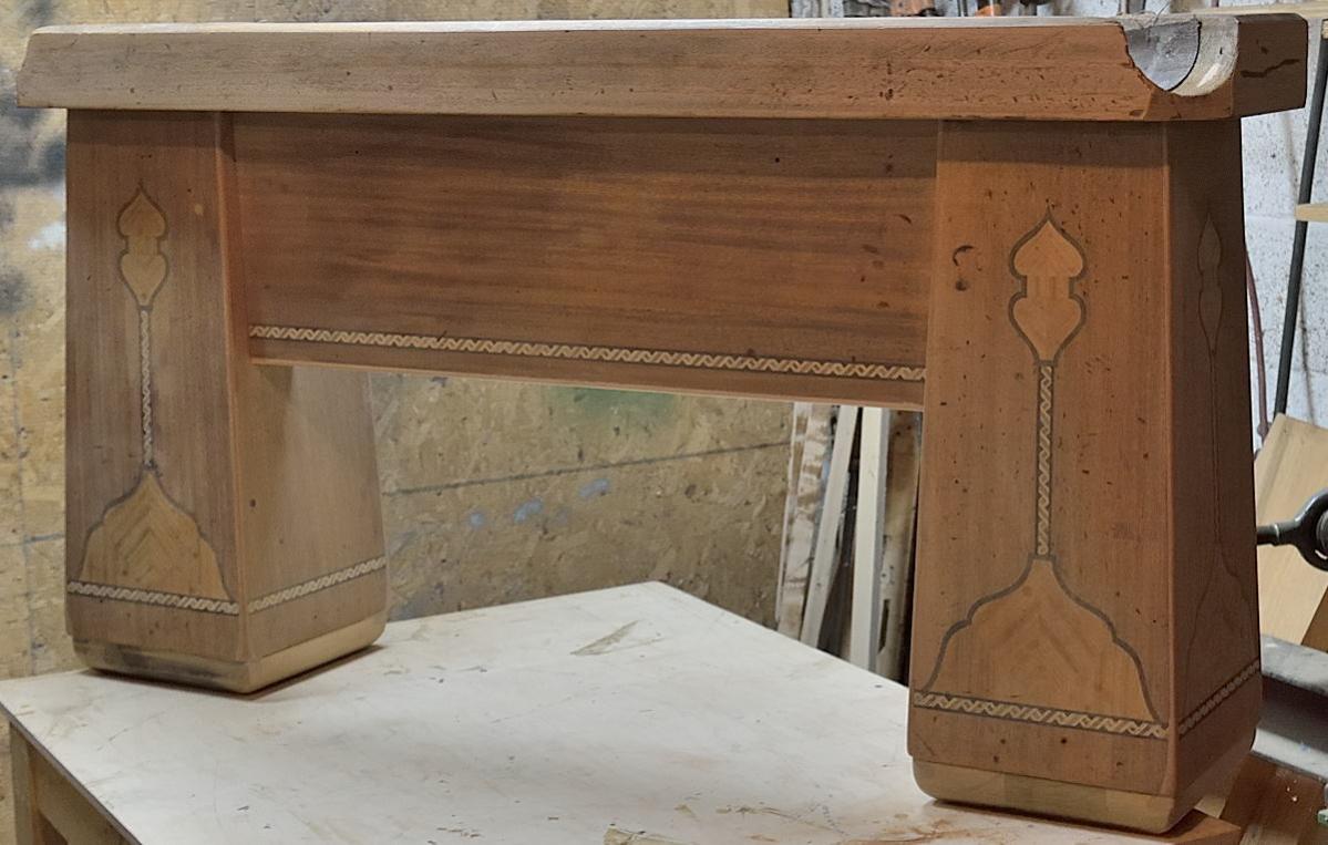 Back at my shop i cleaned up the parts, glued and taped them up, then 2-plied them onto poplar crossband, just like the originals. The banding blanks were made over a year ago, but only just sawed up for use. There's some errors in this that will jump out at anyone looking, but it's going on the table anyway.