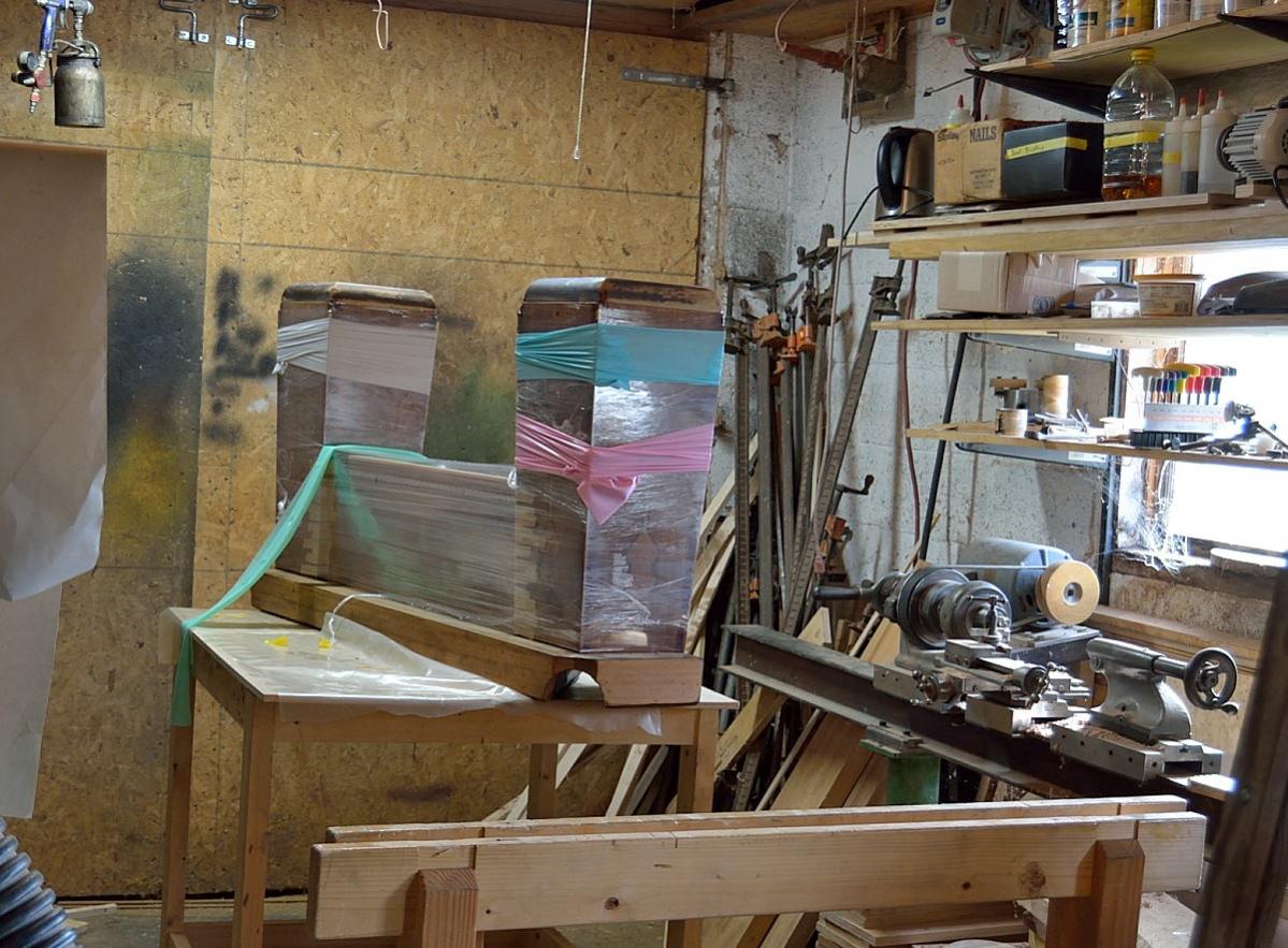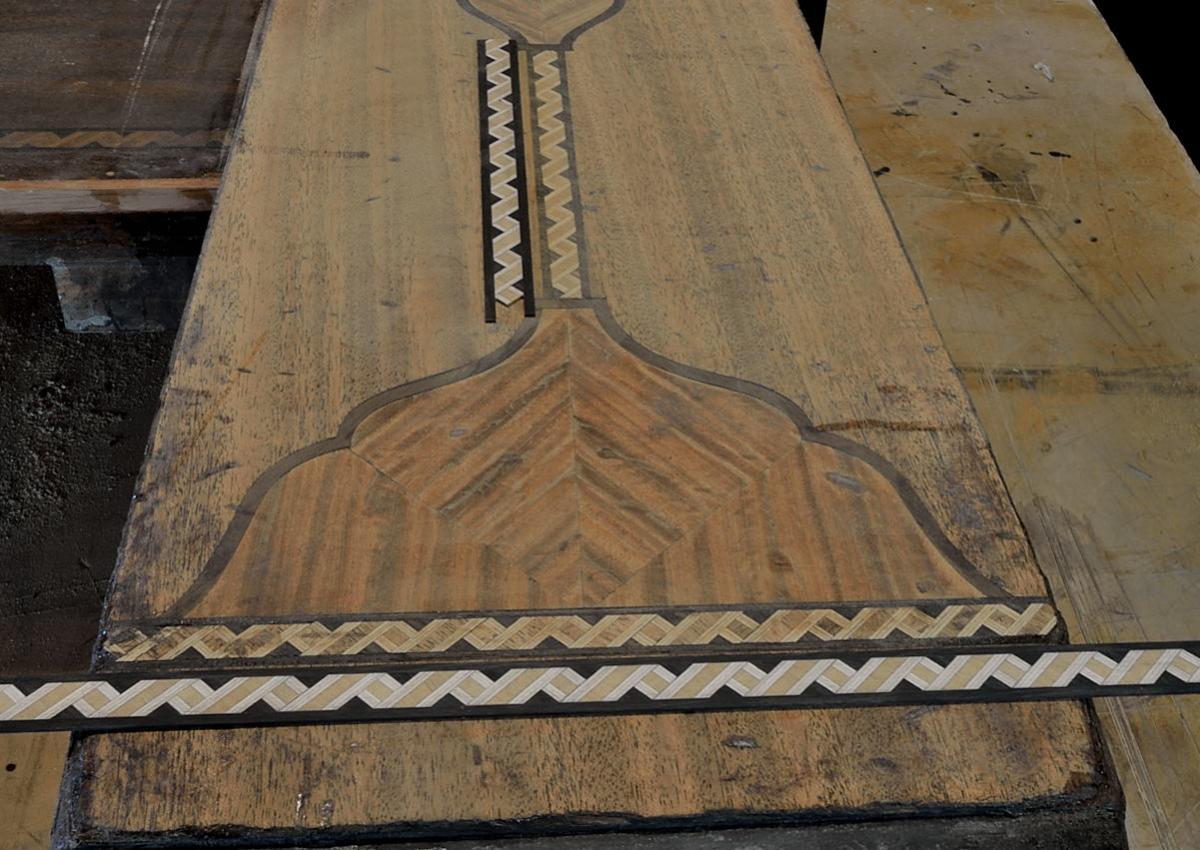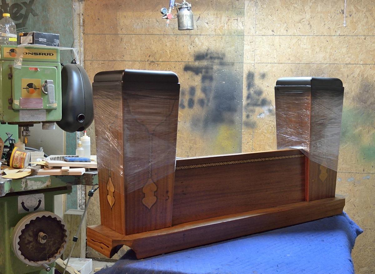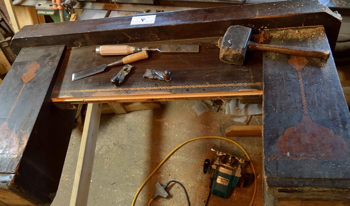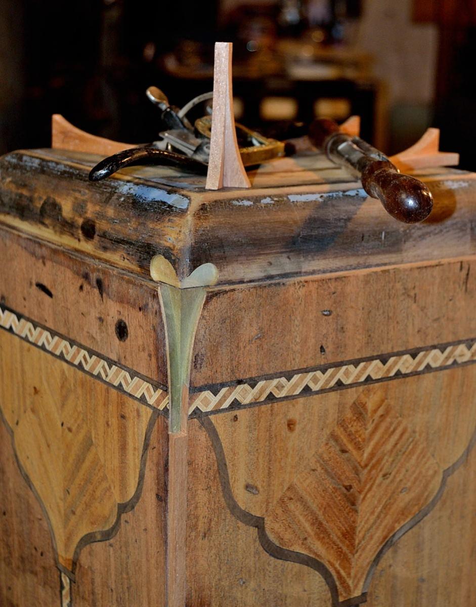 Back at my shop i cleaned up the parts, glued and taped them up, then 2-plied them onto poplar crossband, just like the originals. The banding blanks were made over a year ago, but only just sawed up for use. There's some errors in this that will jump out at anyone looking, but it's going on the table anyway.