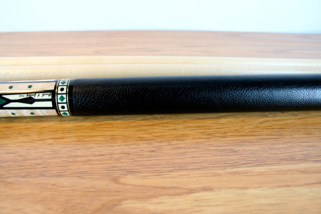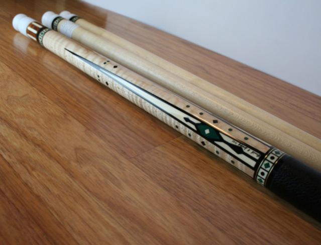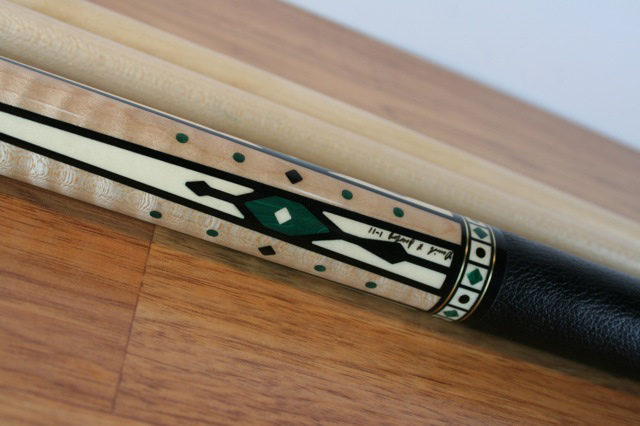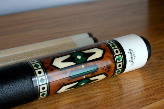 This is a BEAUTIFUL BRAND NEW, NEVER CHALKED, Limited Edition David Jacoby cue. It is numbered 12 of 25. This cue has a curly maple forearm and an amboynia burl butt sleeve. The points are holly inlayed with malachite and ebony, There are two brass rings enclosing holly boxes inlayed with malachite diamonds and ebony dots. the wrap is black textured leather. The butt cap is white phenolic and the joint is amboynia burl inlayed with holly. It has a radial pin and two shafts. It is 19oz. The pictures don't do it justice. When you get it under the light, the malachite really glows. This cue lists for $1795 on the website.