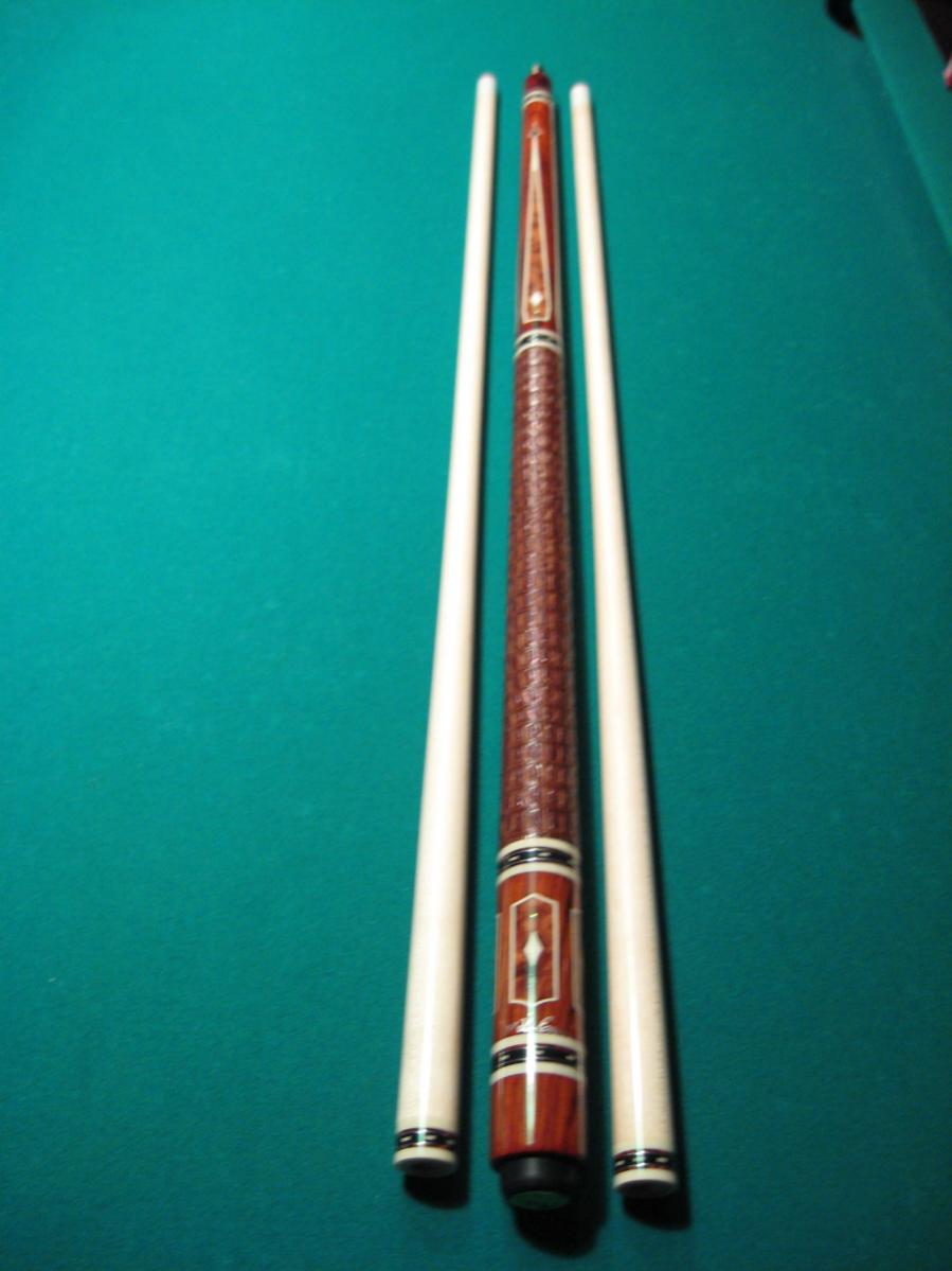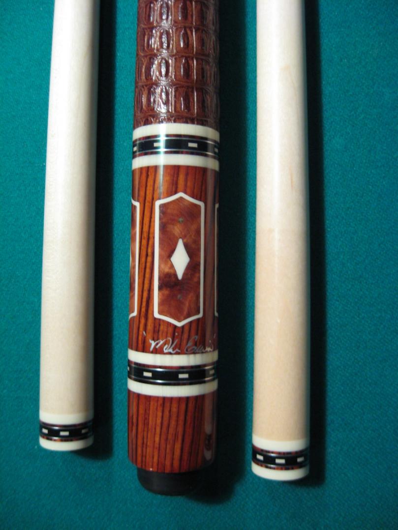 Mike & Scott Erwin Handmade Pool cue.The cocobolo forearm has cocobolo with four Thuyaburl inside the points. Stitched Collars, Eight 1/2" long iv_ry diamonds throughout the cue. Two Shafts that are 3/8 x 10 pin thread that are 13 mm. The cue weighs 18.8 oz and comes with Triumph Tips. The Brown Alligator Leather Wrap