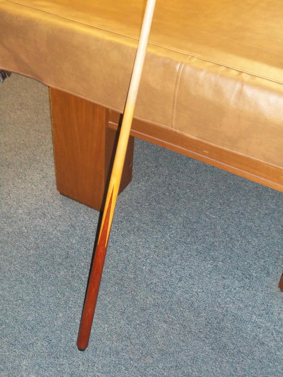 I have a TS sneaky pete that was made in TS shop, either by Tim or by Bob Frey. It was made from a cut down house cue from what I am told so would be one of his very early ones. Any and all info I have about this cue is from peeps in AZ or from research on the www. I don't believe the cue has ever been altered except to install tips over the years. I emailed Bob and he offered to refinish for $125 but I really like the cue as is. The finish has typical wear from a cue that old but I do not see any damage whatsoever to any of the wood. The shaft measures 12.83 at the tip and the weight is 19.5 with 15.25 butt and 4.23 shaft. The cue rolls straight together and apart. Weight is adjustable and the weight bolt is same style as my Schon. The joint is same joint as Schon and also Joss. I have tried to find another cue like this to determine the value. I will sell it at fair market value if I can find out what that is. I believe that Tim is the one who made this cue being that Bob Frey did not understand my descripion of how the butt and forearm are spliced with a filler at the splice. If interested in discussing please reply on AZ or call me anytime at 941-303-9761. I am not particularly a "motivated" seller but would sell if confident of the value. Any sources you know of that would help determine that? Thanks, Brad Adkins