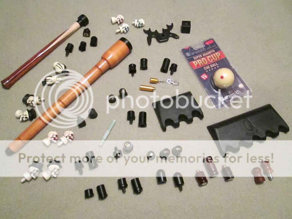 Joint protectors (2 Predator sets, 1 Predator Air 2 set, 1 Joss set and a few Bawdy Parts sets), 2 Q-Claw cue holders (1 is a 3 cue and the other is a 5 cue), Tony Ryan cue extension, Lucasi jump cue butt, G-10 composite 3/8-10 joint pin, tip tool, chalk holder with chalk, Super Aramith measles cueball.