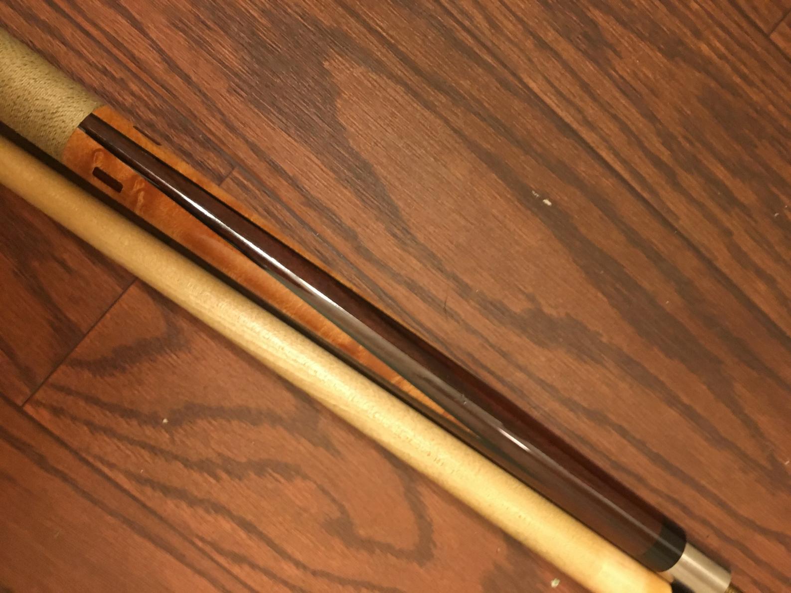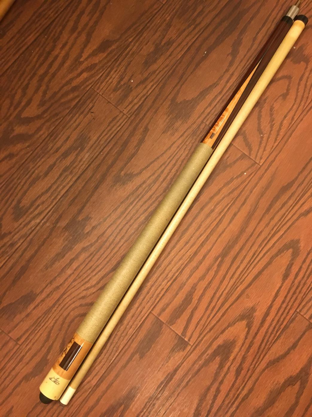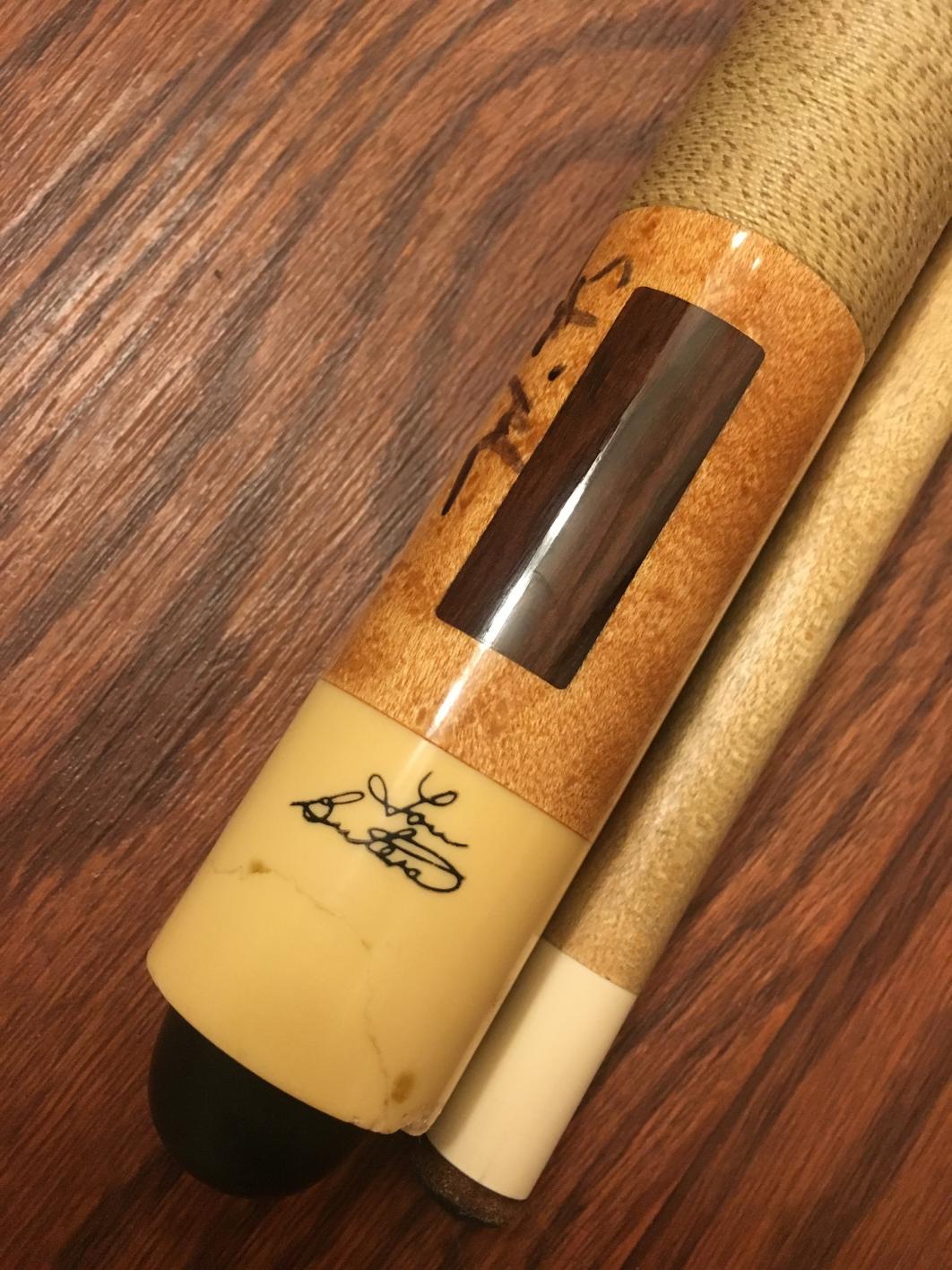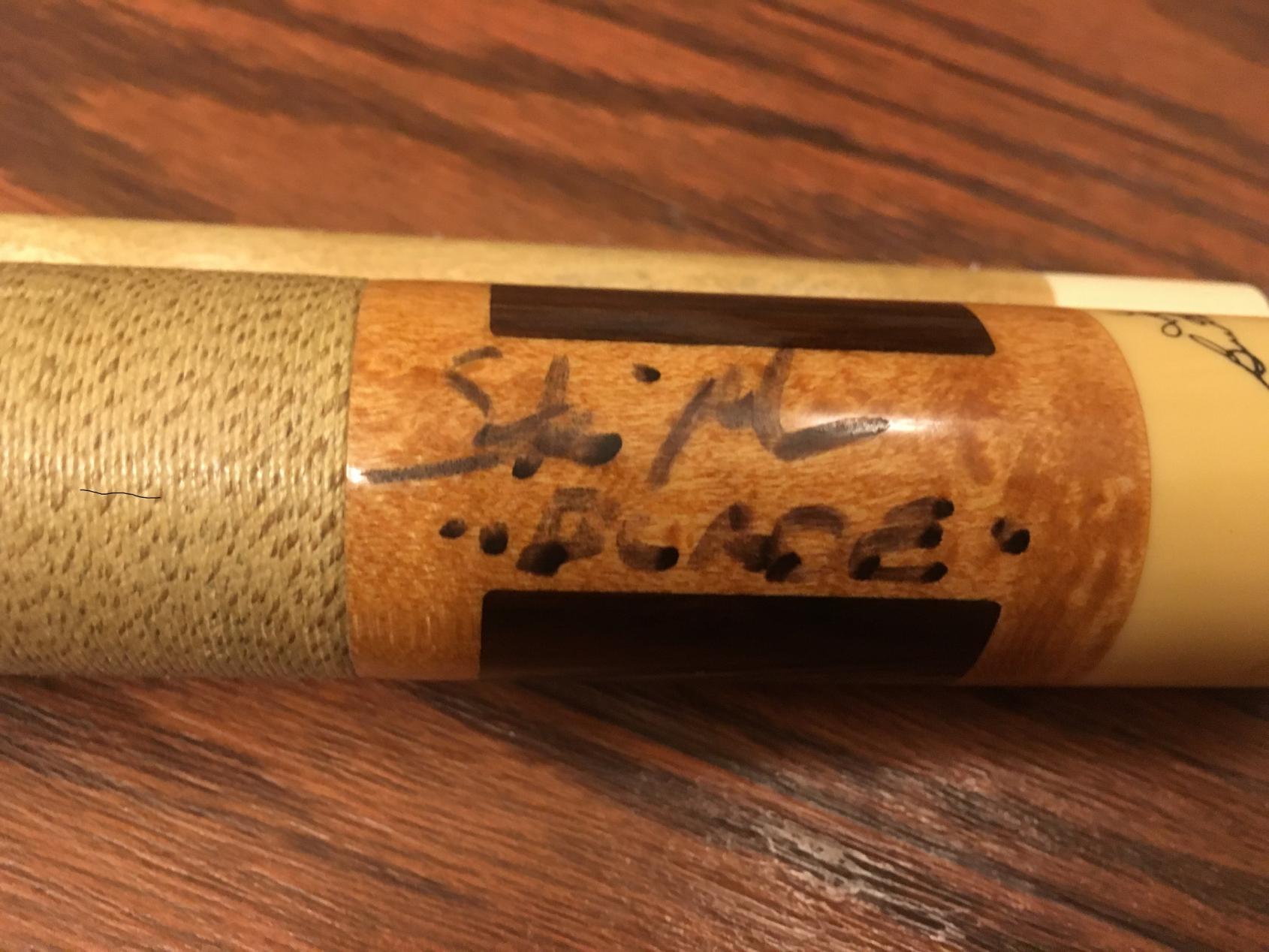 Hello. I have for sale a Lou Butera cue made by Viking. These were made in the 90's and there were 17 models to choose from. It was the Lou Butera "top Cues" line and mine is a TC-16. the majority of these cues were fairly plain cues. This cue has three points with a single black veneer, each with an oblong box inlay and three matching inlays in the butt sleeve. Lou Butera signature on butt cap. I also believe this cue is signed by Steve Mizerak with the word "peace" in quotation marks.The cue is in nice condition. The worst being the butt cap it has a small chip at the bottom , the lines you see are from peeling varnish not cracking and there is a small ding in between the points that I tried to capture.