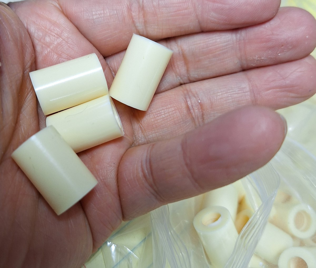 After this morning's flak session, I went to my shop and repeated the informal test discussed above. Today I hammered on Tomahawk and ABS, only. The test results are different. Today I used threaded joint collars of similar size, made of black ABS and white Tomahawk (I have no more black). I first put ABS on the anvil, held it steady with a wooden dowel thru its id, and smacked it good with the large end of a 26 oz ball peen hammer. The hammer bounced off. I smacked it a couple more times and got the same result. Next I repeated that process with Tomahawk and got the same result. Then I smacked the Tomahawk several more time, firmly, and it did not fail. I then attacked the ABS again and smacked it repeatedly. The ABS did fail after about 7 or 8 blows I then smacked the Tomahawk collar several more times and it still didn't fail. I then repeated this test using a new threaded ABS joint collar and it similarly failed after about 7-8 impacts. So, allow me to clarify any misconceptions I may have created this morning. Tomahawk is strong as hell, stronger than ABS. I turn 79 in June and been around a lot of blocks; don't wish to be viewed as a bullshit*er at this stage in life. I don't know why the first test produced different results. I can only say that test was quickly done and done for the sole purpose of confirming the utility of ABS for cues, which it did to my satisfaction.