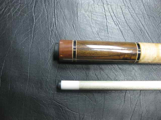 Firstly, the entire cue weighs 19.6 oz.. The butt weight 15.5 oz and the shaft weights 4.1 oz.. The pin is an Acme thread 3/16" titanium pin (the pin has been branded "Kaisen" on the tip of the pin when viewed from above). About the weight and balance: Greg does not used removable weight bolts in any of his cues, so as to avoid creating a butt heavy cue and in order to achieve a proper balance point. He has added the weight in the forearm of the butt, which is where it balances. The result really is excellent balance and playability.