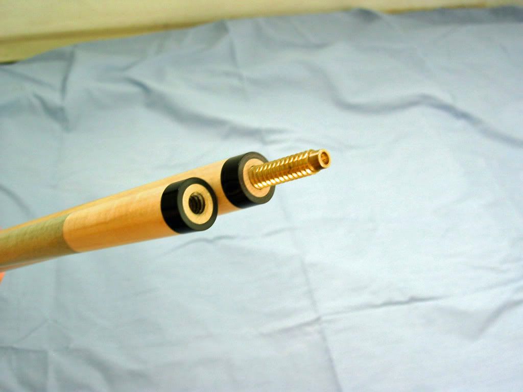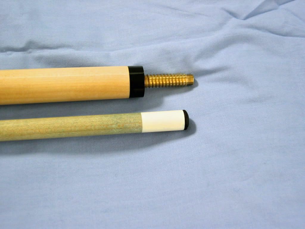 It's a Schmelke blank retapered, with leather wrap and ivory hoppe ring added. Phenolic joint sleeves, 3/8-10 pin (extra long) w/ wood to wood contact. Shaft is tapered by Bonner, close to 13mm, tip unknown and slightly mushrooming. It's a nice 18.75-19.00 oz. IMO it is a solid hitting cue, with some flex in the shaft, crisp feedback, lots of easy english. Used condition with some nicks, scratches, etc. Served as a nice bar and reliable backup cue.
