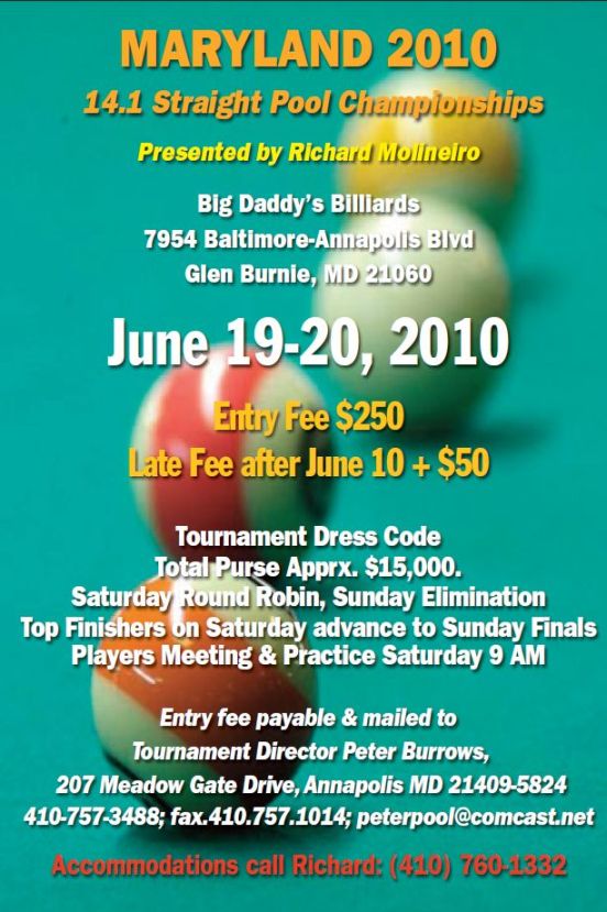 It's almost that time of year again! Straight pool in Maryland! Many big names have played this event in the past. Danny Harriman won it all last year defeating Dave Daya in the final. Jeanette Lee stormed into 3rd place last year.