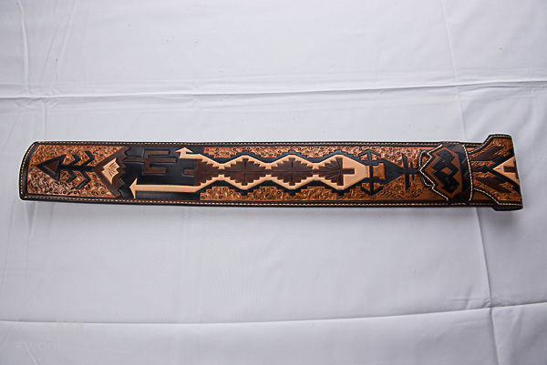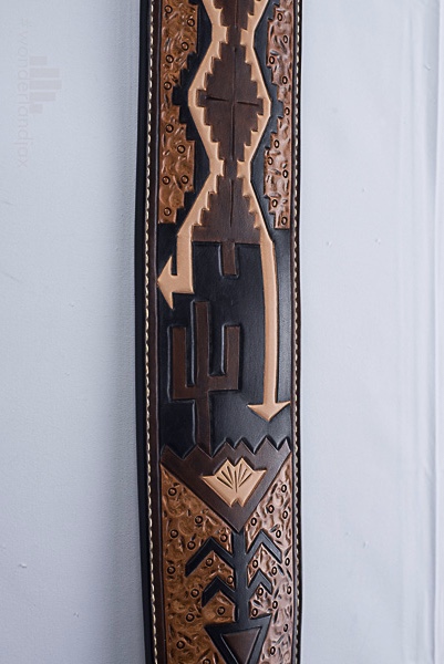 The top has an abstrct turtle design and the body is very detailed. This is envelope style case carries a butt and 2 shafts. On the front there is a cactus embossed with lines with and arrow doing down and another going to the righ...or you could say sort of pointing south and west.