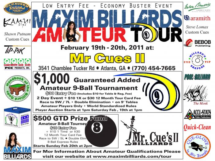 MAXIM Billiards Amateur Tour = $1,500 8Ball & 9-Ball on 2/19-20 in Atlanta